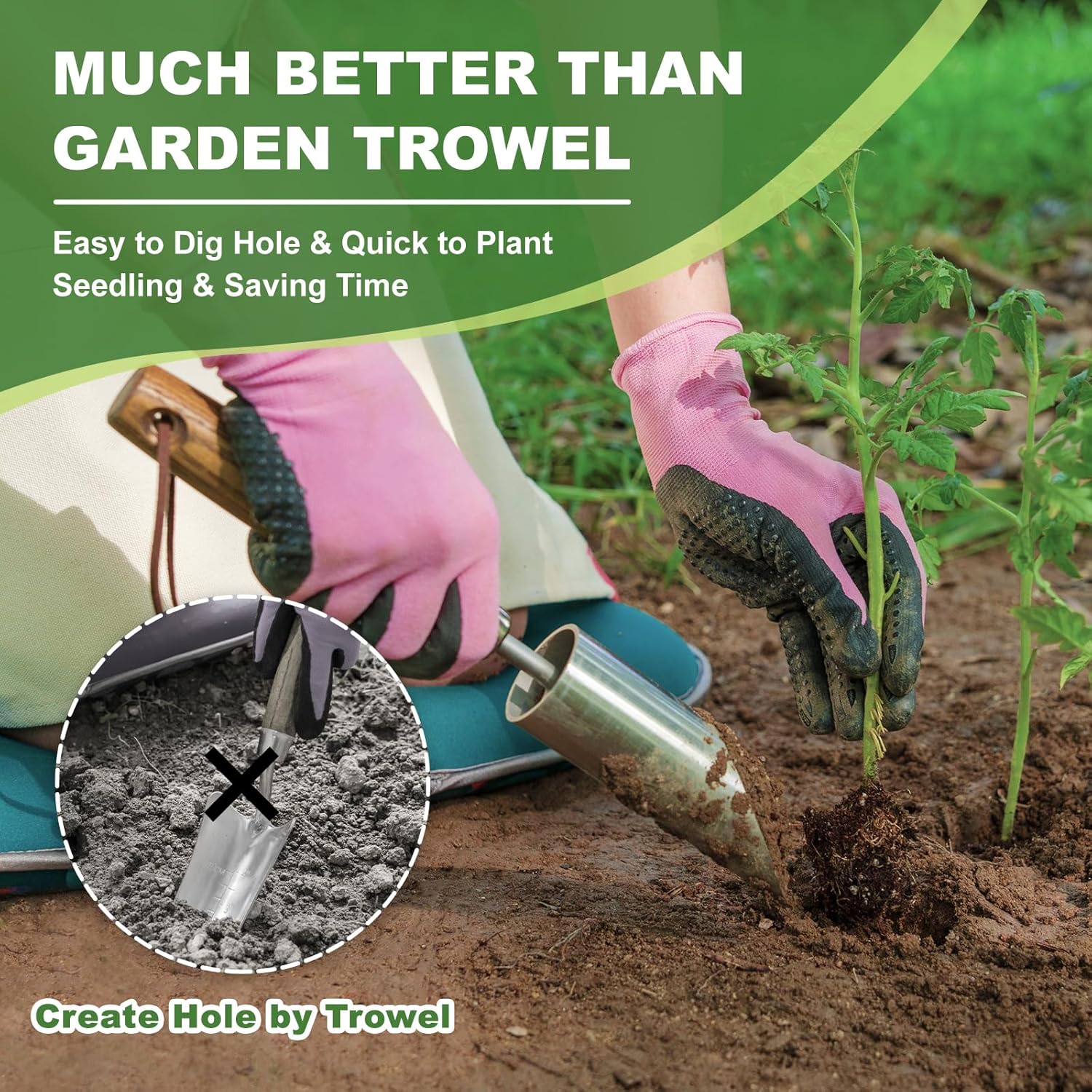 - 【Sharp Edge Helps Thru Soil】The hand bulb planter has a sharp edge at the base, which makes it easy to guide the tool into the ground. You just push and twist the tool, it will slice thru the heavy soil and get a perfect hole to plant seeds and seedlings.