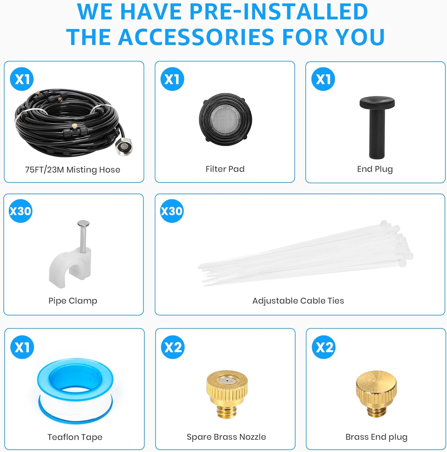 - 【Tool-Free DIY Installation – Customize as Needed】Quick and easy setup—just connect to any standard 3/4" garden hose with the included solid brass adapter. The patio misters for cooling outdoor system is pre-assembled, with extra nozzles and accessories included, allowing full customization for different areas and setups.