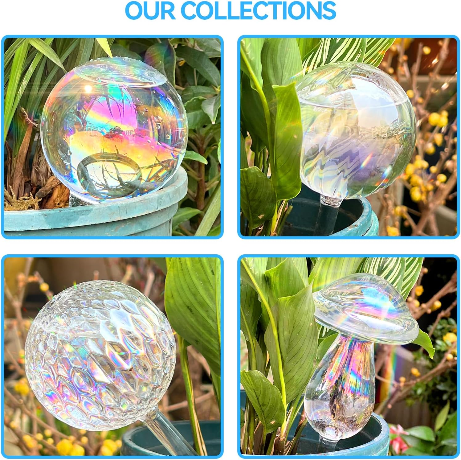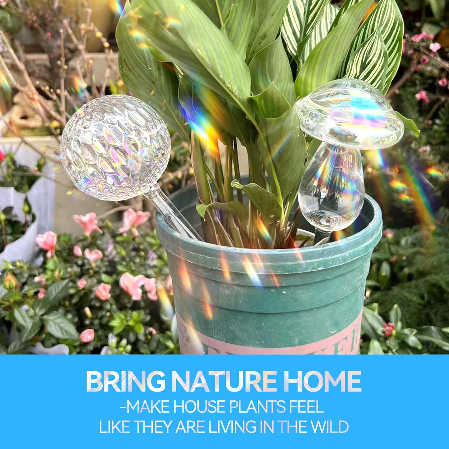 - 【Elegant Iridescent Glass – Decorative & Functional】The top of one spike is mushroom shaped, the other is a sphere. Made of hand-blown, rainbow glass, these water bulbs for indoor and outdoor plants add charm and visual interest to your plant displays. More than just plant self watering devices—they’re beautiful glass watering globes for plants, too