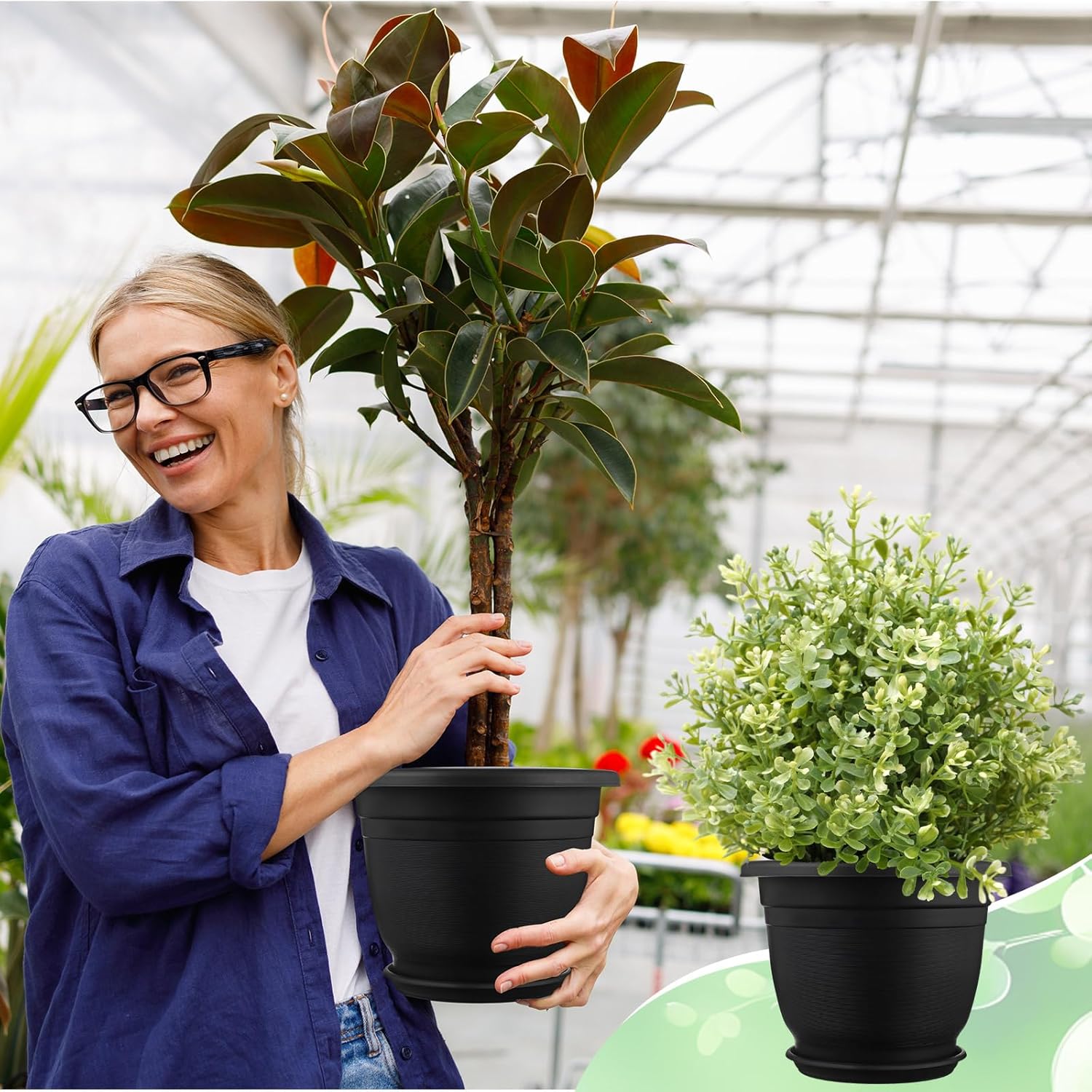 12 Pack 8+'' Plastic Plant Pots Round Planter Pots with Saucer Tray Seedling Pot Hole Seed Resin Plant Pot Starting Nursery Flower Container with Pallet for Garden Outdoor Indoor(Black)