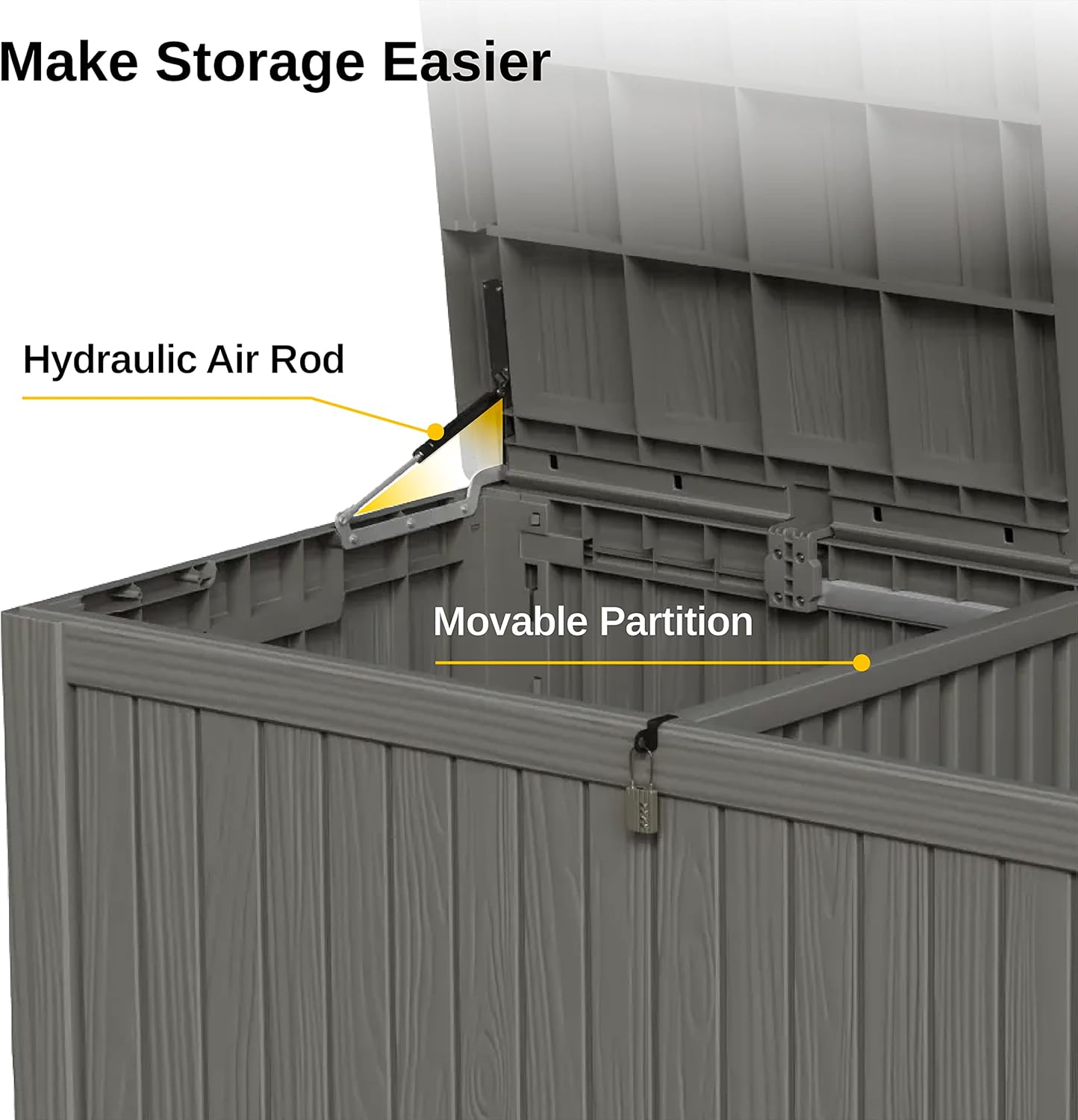 - š¦ššš šš”š šØš¦šš„-šš„ššš”ššš¬ ššš¦ššš”: Featuring a hydraulic lever mechanism, this outdoor storage box ensures smooth and safe operation, eliminating the risk of hand injuries. Inside, a detachable partition allows for organized, sectioned storage of your items.