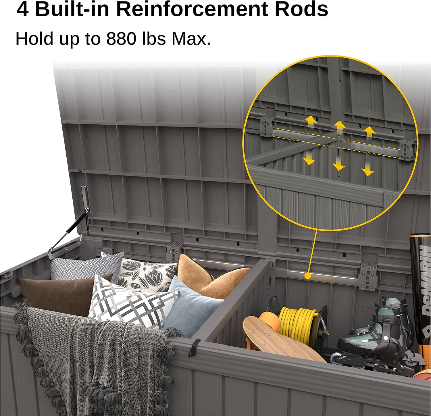 - ššØš„šššš šš”š šš¢š”š-ššš¦š§šš”š: Crafted from weather-resistant resin, this deck box resists rust, peeling, and denting, offering greater longevity than wooden alternatives. Equipped with 4 built-in reinforcing rods, it maintains its shape even after prolonged sun exposure.