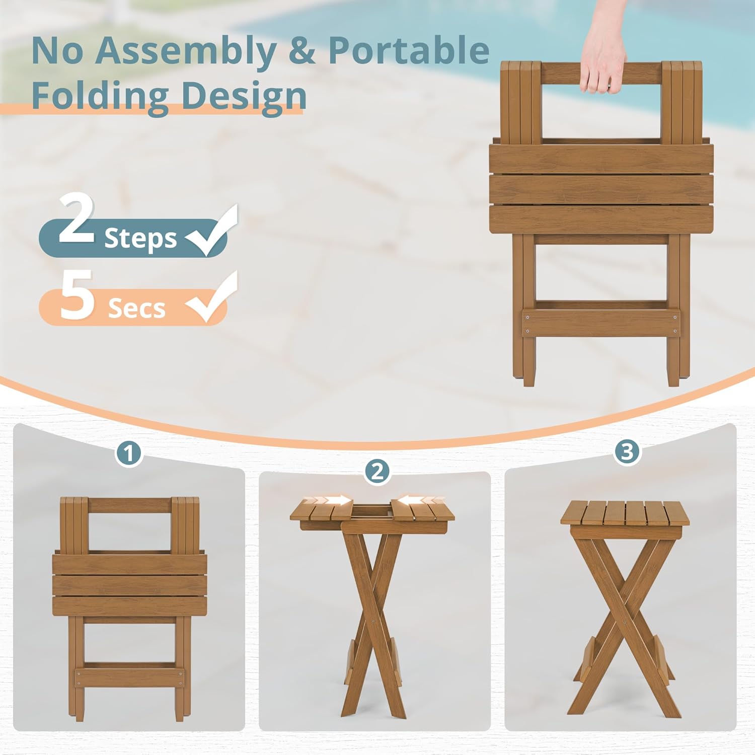 LUE BONA 27 inch Folding Side Table, HDPS Outside End Table for Patio, Porch, Deck, Pool, Weather Resistant, Teak Color Oil Printed