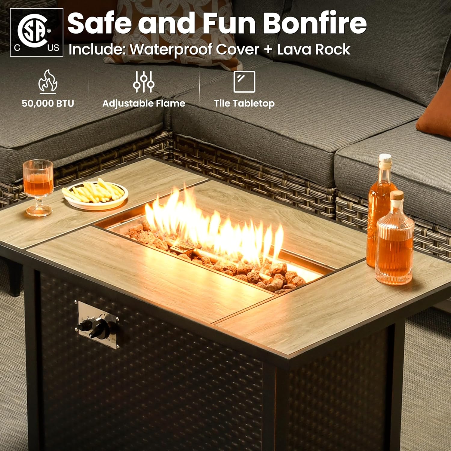 - Outdoor Fire Pit Table: 42 inches gas propane fire table has 55000 BTU powerful heat output with CSA certification to make sure the quality and safety are excellent for you to use. Creating a warm and romantic bonfire atmosphere. Equipped with a flame adjustment device, the simple switch control panel