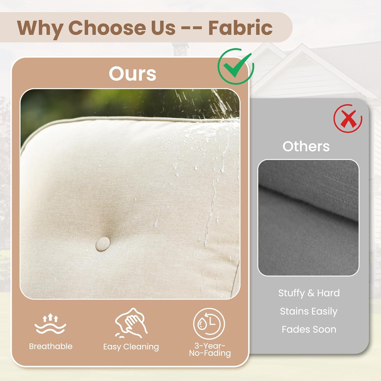 - Texture Woven Fabric: Cushions are covered by yarn dyed woven fabric, the yarns are dyed and UV treated before woven into fabric for out door fading resistant and water repellent. Looks and touches with high-end woven texture. No more worry about getting cheaply made thin print fabric. Detachable & washable