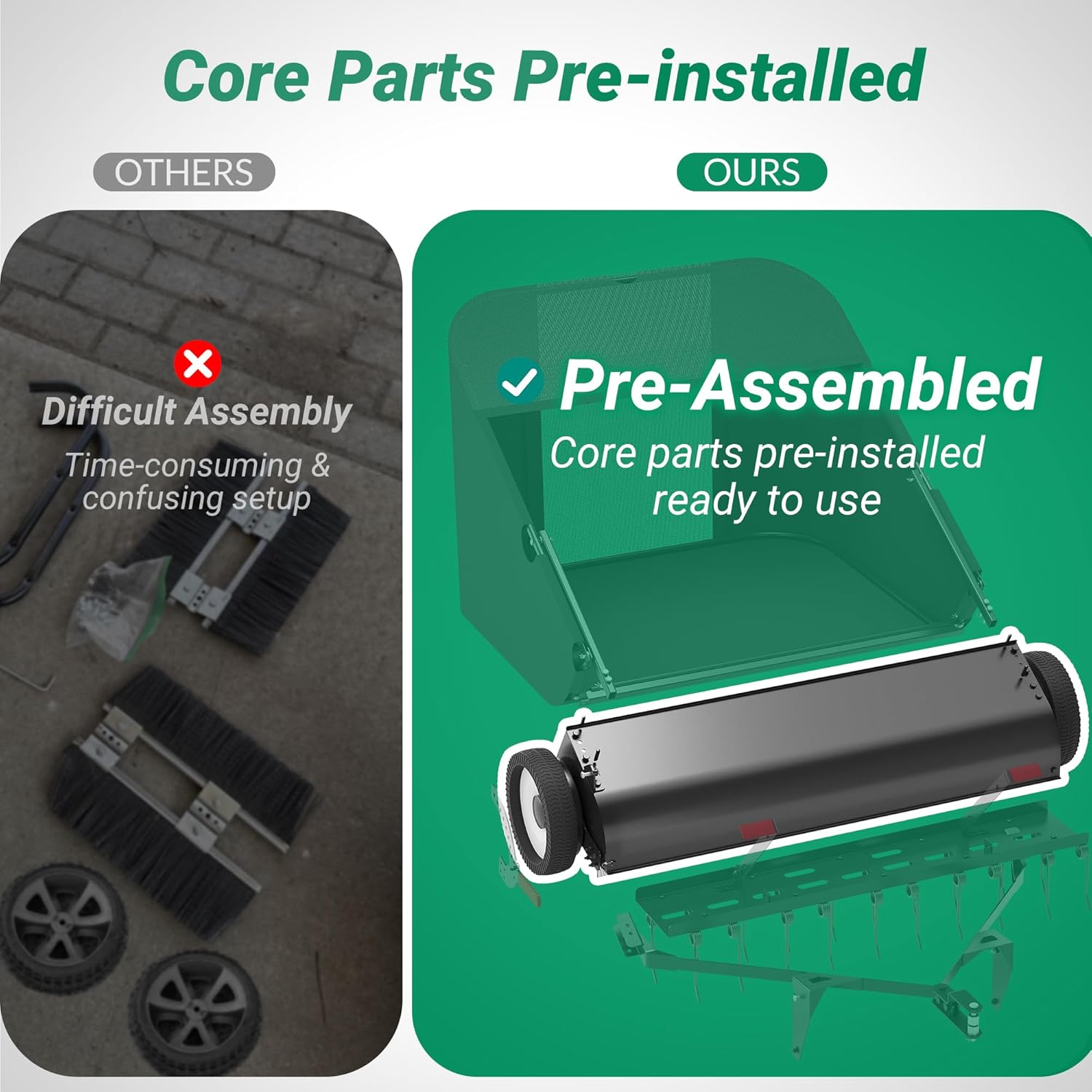 - Quick Setup with Pre-Installed Parts: Save valuable time with pre-installed core components that simplify the setup process. No more fumbling with excessive parts or complicated instructions—just a few quick steps and you're ready to go. Designed with the busy homeowner in mind, this user-friendly sweeper lets you get started on yard work faster while minimizing assembly effort, so you can focus on maintaining a healthy lawn.