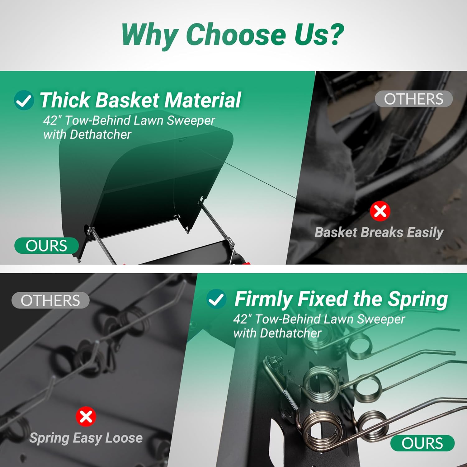 - Dual-Mode Functionality: The Suchtale 42" Tow-Behind Lawn Sweeper with Dethatcher combines two essential lawn care tools into one efficient unit. Easily switch between dethatching to remove embedded thatch and sweeping to collect grass clippings, pine needles, and fallen leaves. This all-in-one solution eliminates the need for separate machines, making lawn care more efficient and convenient for large or small yards alike.