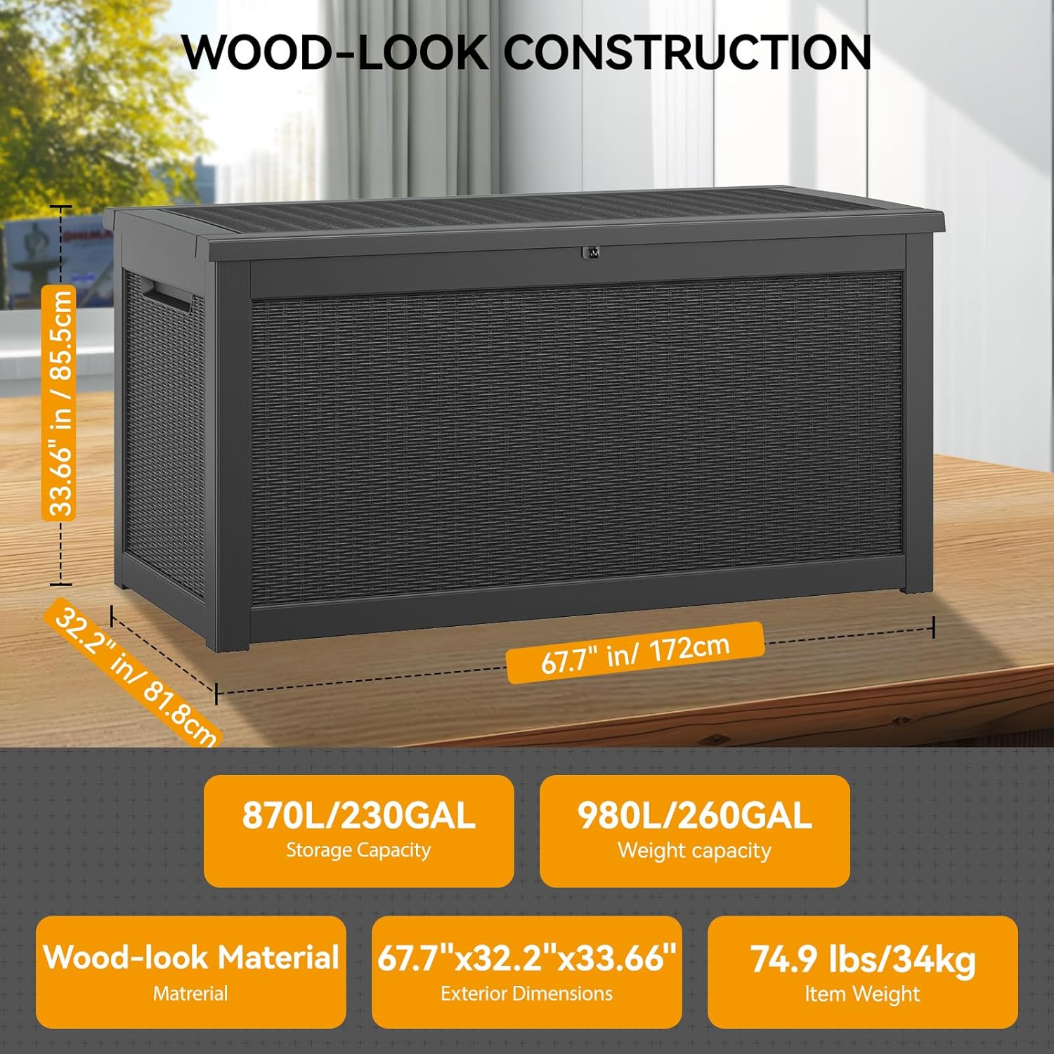 - Immense Storage Capacity: With dimensions of 67.7 x 32.2 x 33.6 inches, this deck box offers perfect storage space for all your outdoor essentials. It can hold up to 180 gallons of garden tools, pool supplies, patio furniture, cushions, and more.