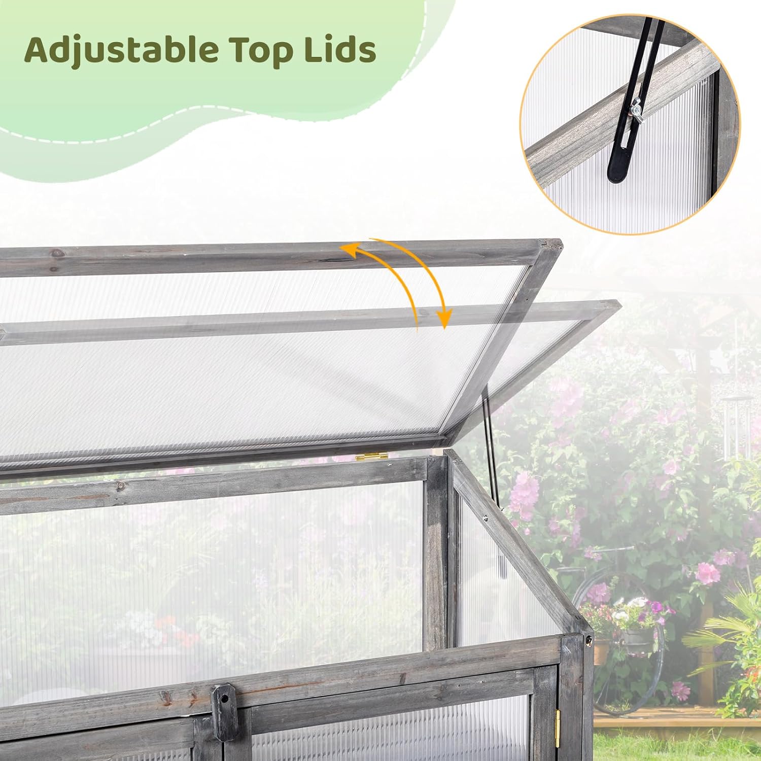 - 【Multi-Angle Openable Roof】 You can use the bolt on the side to hold the openable roof in your desired position. By placing the screws at different points along the rods, you can regulate the size of the vents. This setup constructs a robust ventilation system, ensuring your plants thrive in diverse weather conditions.
