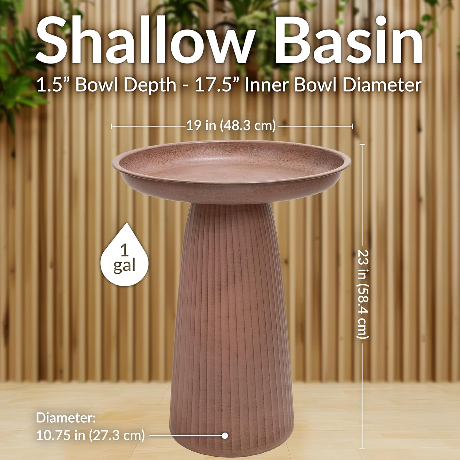 - GREAT SIZE FOR BIRDS: This large bird bath measures 19" diameter x 23" H. The bowl has a 1.5" bowl depth and holds 1 gallon of water. The pedestal has 10.5" diameter base with a hollow 21" inner height. The outdoor bird bath weighs 7.6 lbs for easy placement.