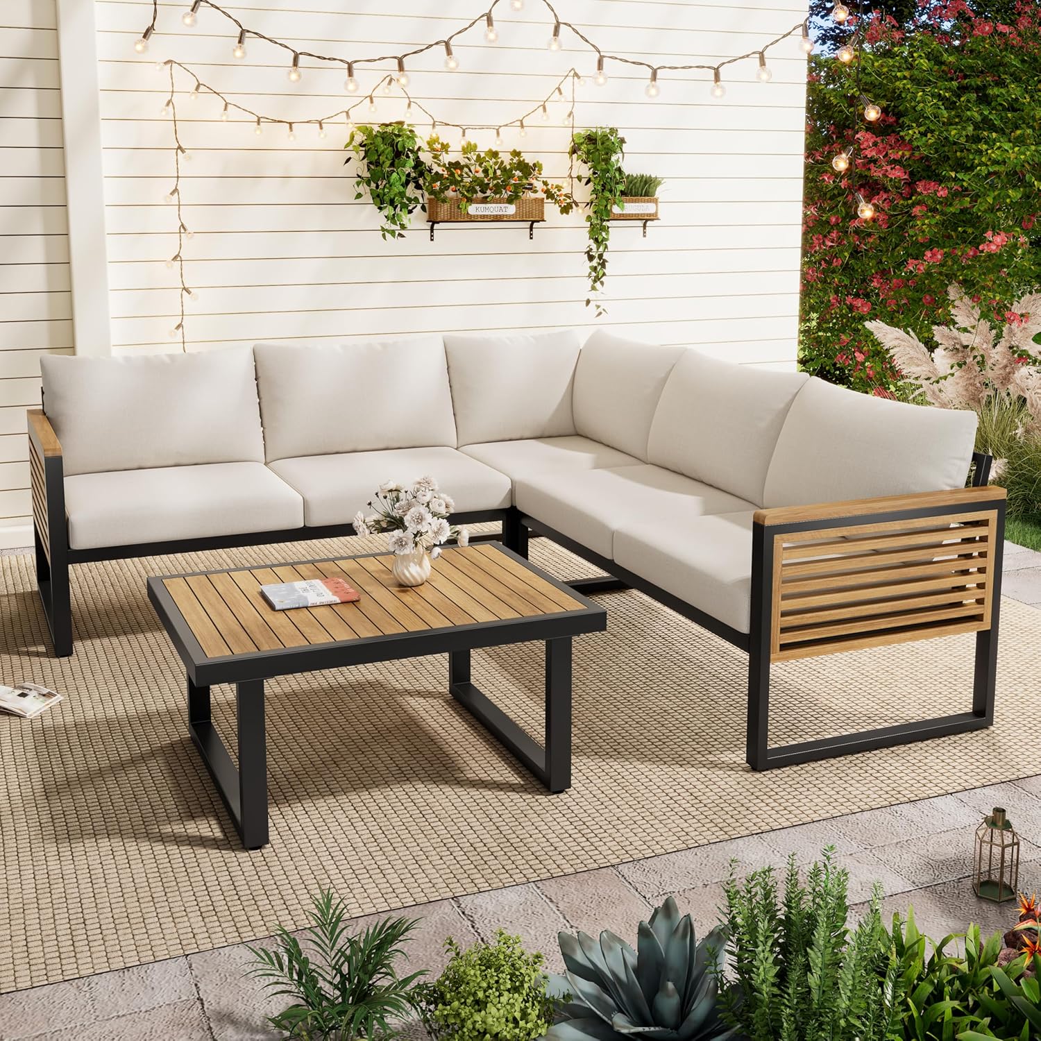 Outdoor Patio Furniture Set, 4-Piece Acacia Wood and Metal Patio Sofa Corner Set with Coffee Table, Modern Conversation Set for Backyard Porch Garden Balcony