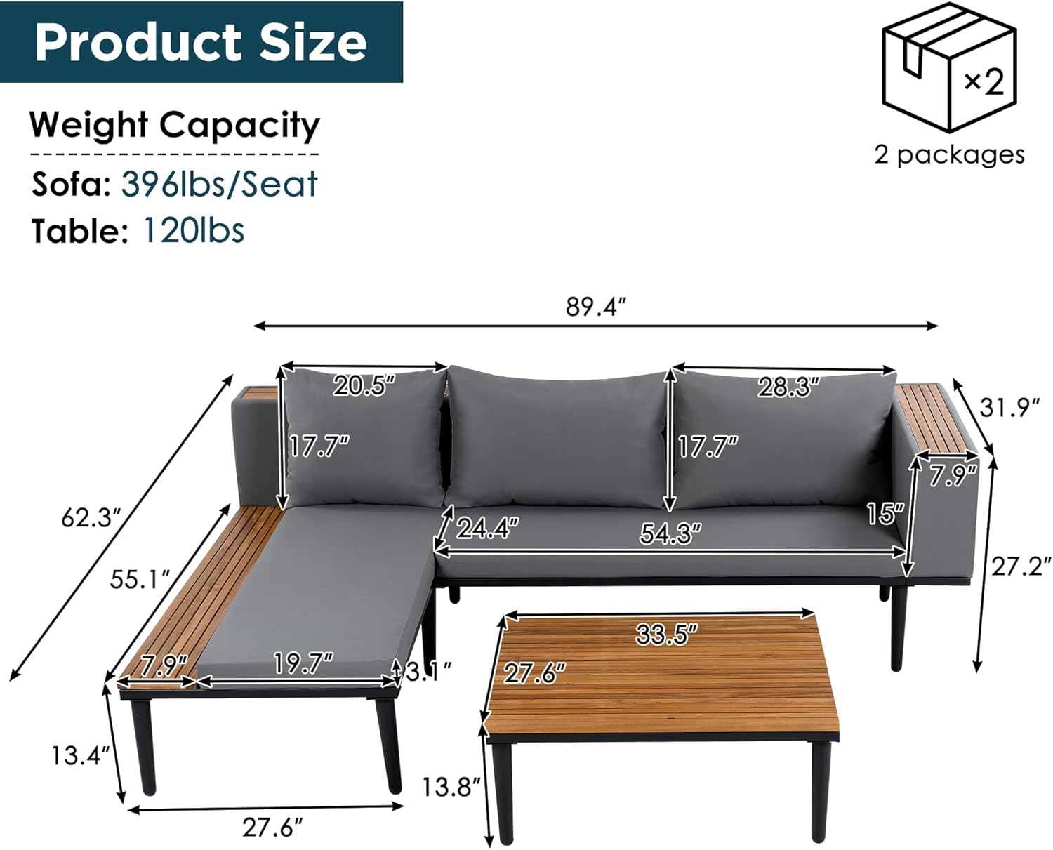 Acacia Wood Patio Furniture Set, Luxury Outdoor Conversation Sectional Sofa with Removable Cushions and Coffee Table, Side Table, L-Shaped Sofa Set for Backyard, Porch (Gray/17)