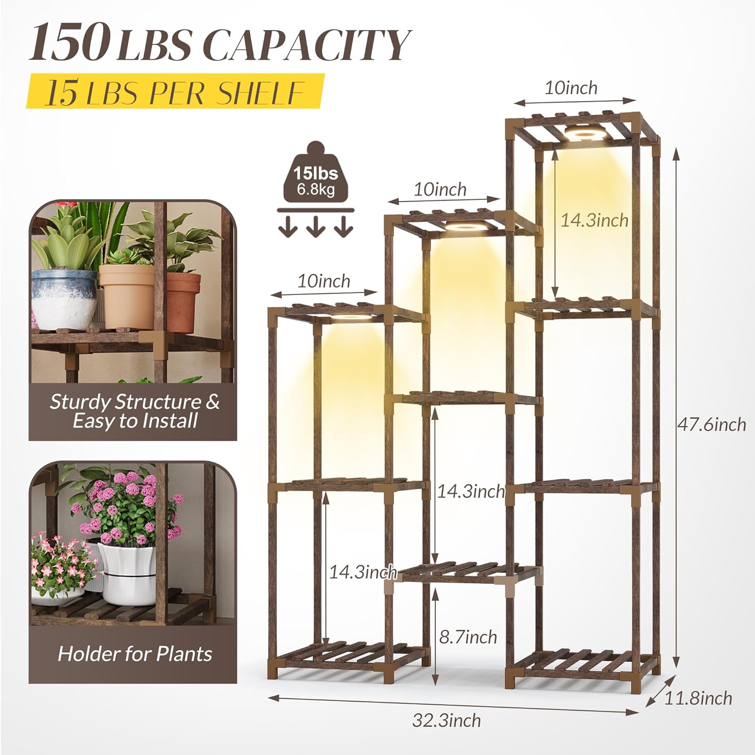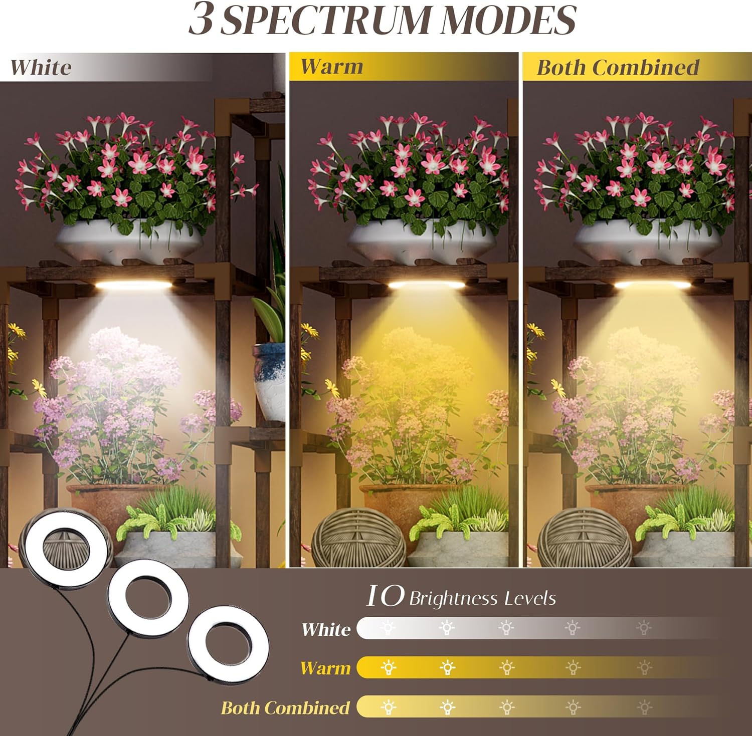 - Plant Stand with Three-Mode Full-Spectrum Light System: This indoor plant shelf comes with adjustable grow lights to support plant growth at every stage. The three-head light system offers warm white, cool white, and a combined dual-light mode, ensuring your plants receive the ideal lighting environment. It eliminates the need to move plants outside for sunlight. Energy-efficient LEDs provide a natural spectrum to enhance plant vitality and create a cozy ambiance in your space