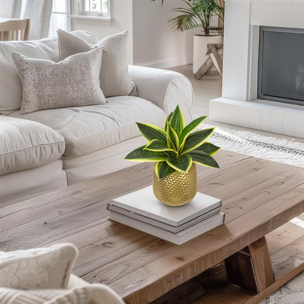 Hollyone Artificial Snake Plants 9" Faux Agave Succulent Plant Potted in Gold Metal Pot Fake Sansevieria Aloe Tropical Plant for Desk Modern Office Home Bathroom Indoor Outdoor Decor