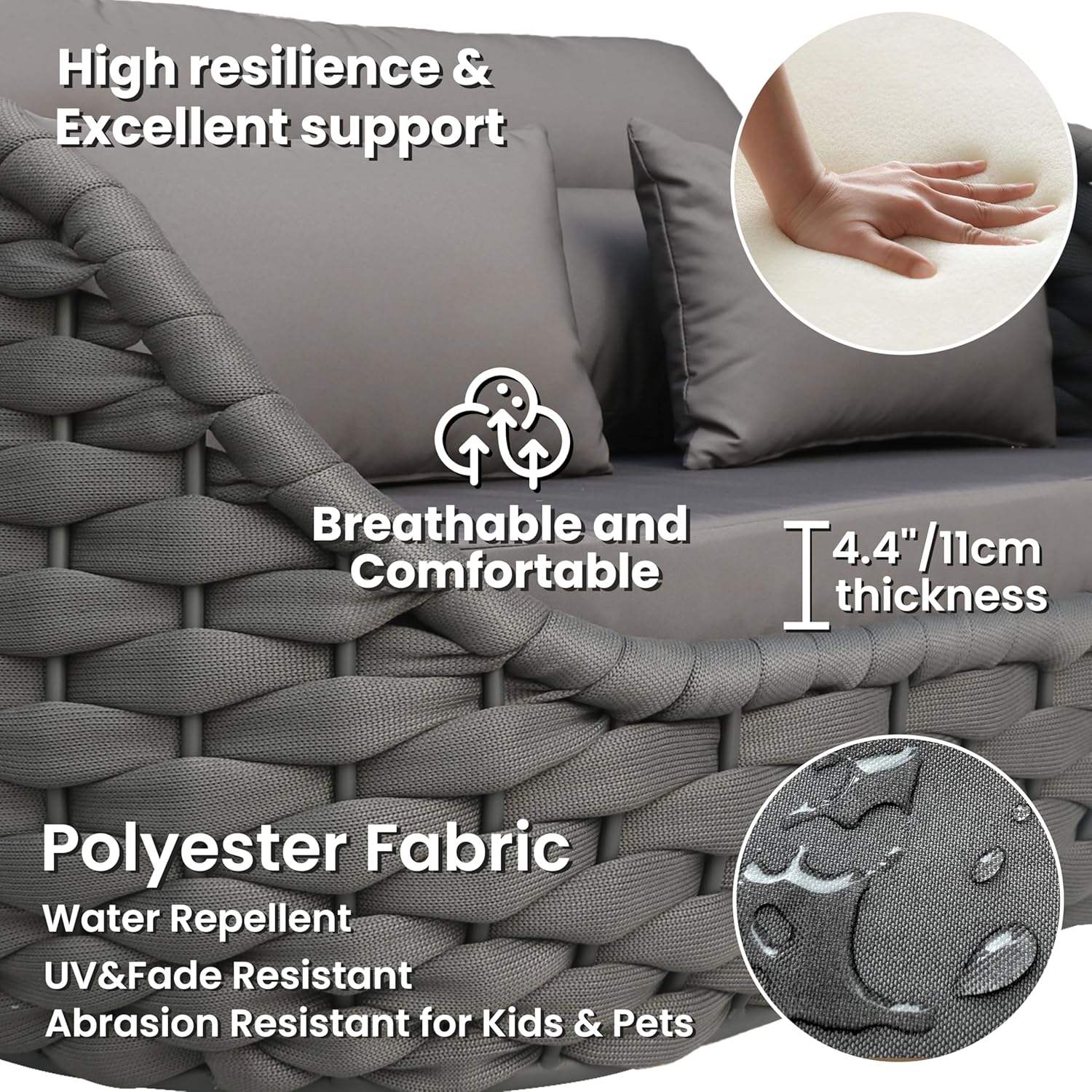 - Filled with 4.3"/11cm thick high-density foam and cotton, cushions are soft touching and breathable for a refresh comfy outdoor seating holding its shape in long time using. Water repellent and abrasion resistant polyester fabric also fits families with kids and pets