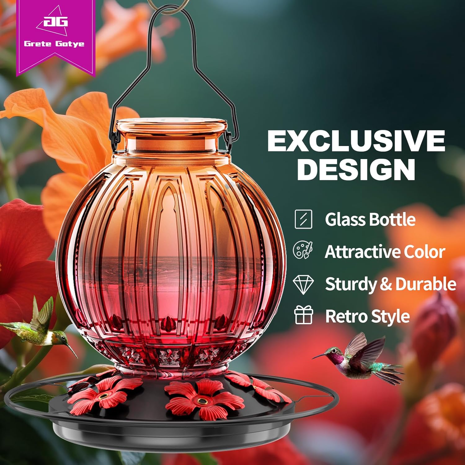 - 🐦️ATTRACT HUMMINGBIRDS: These humming birds feeders for outside design with vibrant colors and intricate details, made of a high-quality nectar glass container in a nice retro-style ball shape, ensuring longevity and durability compared to plastic counterparts. Ensuring long-lasting use in outdoor conditions throughout the year and never fading. 5 flower shaped feeding ports, 26 oz capacity with 5 feeding stations, and perch in a circle to accommodate multiple hummingbirds.