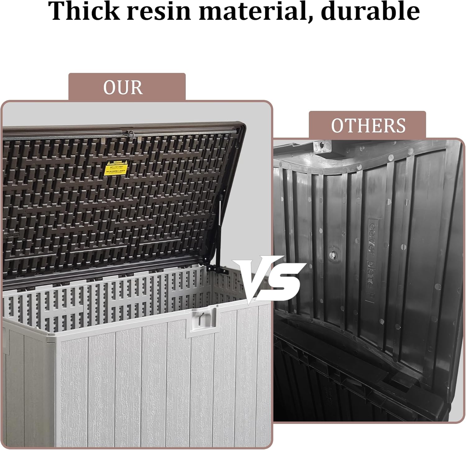 - Weatherproof Resin for Year-Round Use. Durable, waterproof resin, this deck box resists rain, sun, and UV exposure. Ideal for all-season use, it won’t peel, rust, or warp like wooden or metal boxes—keeping your items protected outdoors.