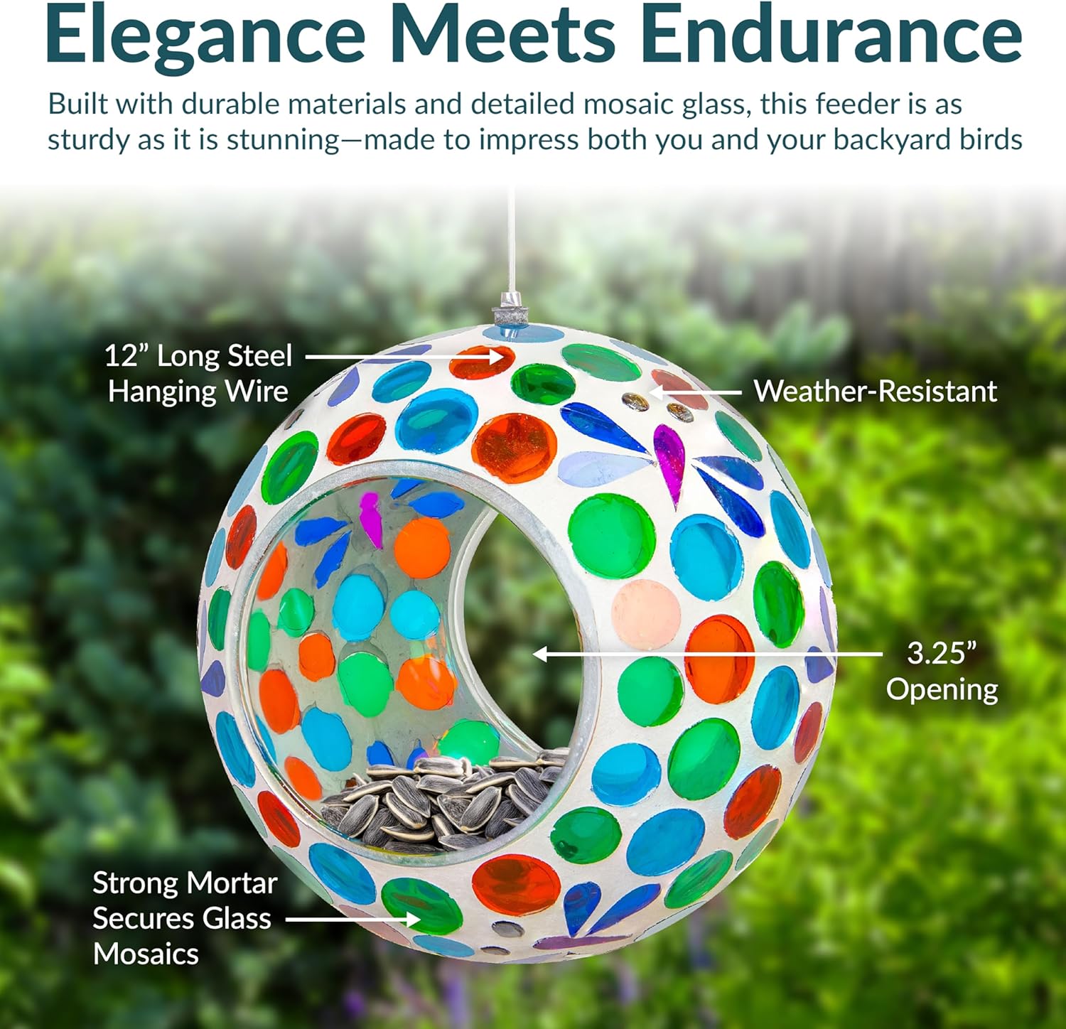 - EASY TO FILL: The 3.25" diameter opening can be accessed from two sides, making it easy to fill the glass hanging bird feeder with seeds. The small drainage hole in the bottom of the mosaic bird feeder helps to keep seed dry and prevent moisture from building up. The mesh tape placed over the hole allows moisture to drain without spilling the seeds. It holds approximately 1 cup of small birdseed blend. Please note that the amount of food may vary depending on the type of seed you use.