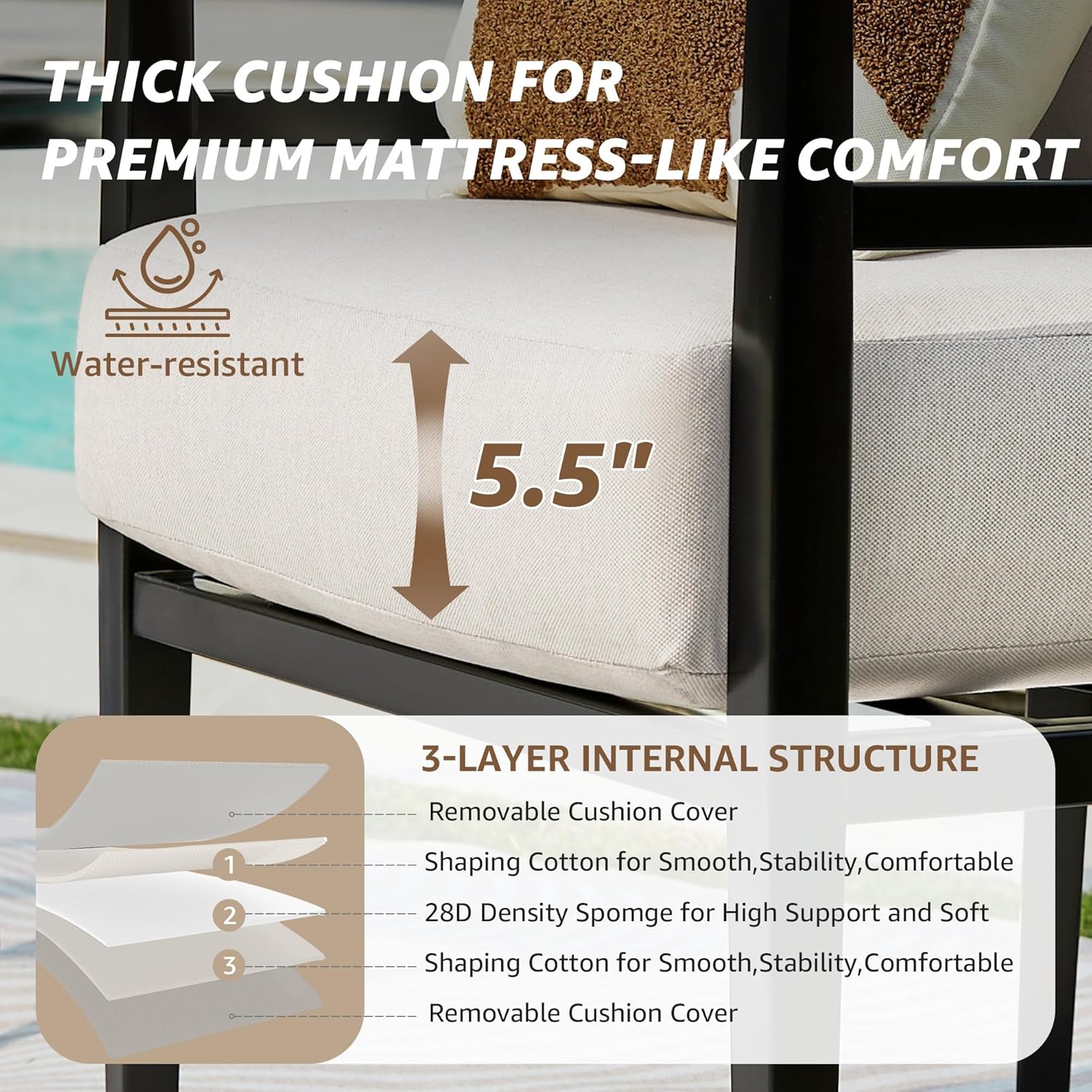 - Comfortable 5.5-inch Cushions: Seat cushion 5.5. The curved top backrest cushion fits snugly against your neck to provide optimal ergonomic comfort. Filled with high-resiliency sponge, the round seat cushion on the outdoor furniture chair balances well with the sturdy frame. Completely carefree and cozy up on this patio set for a good time!