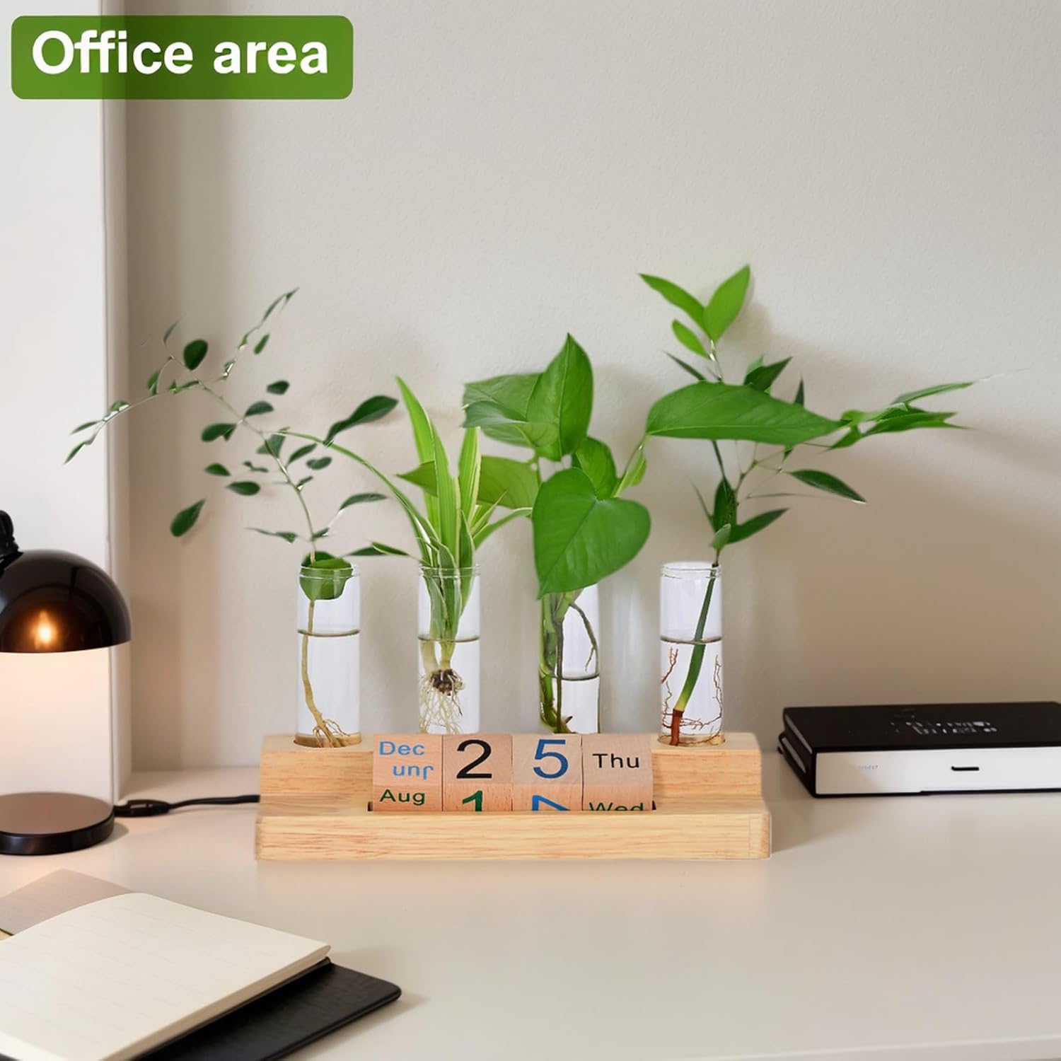 - VERSATILE DESIGN: Combines 4 glass propagation tubes with wooden block calendar, perfect for desk organization and plant propagation - measures 8.8 x 3.35 x 4.8 inches