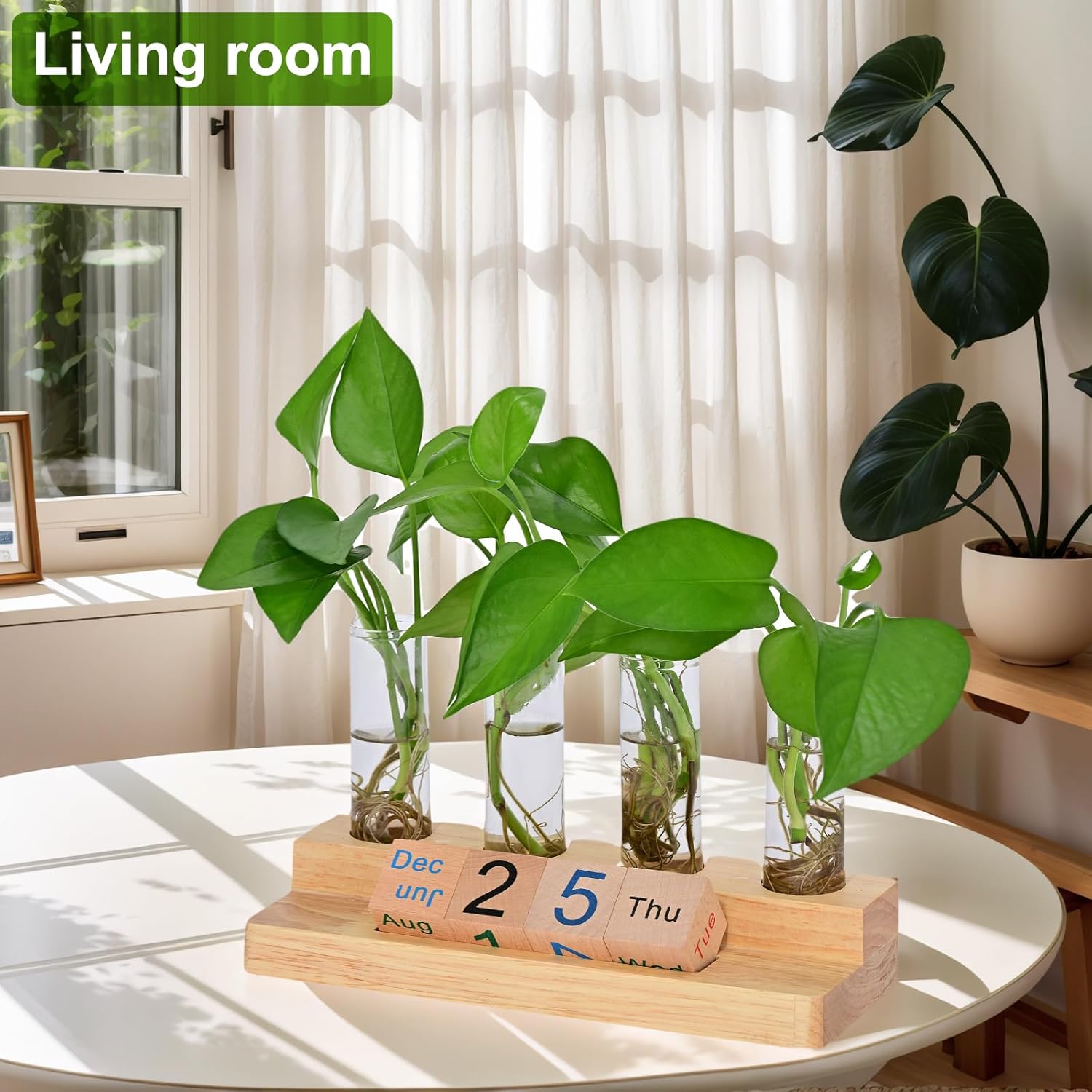 - EASY SETUP: Ready-to-use propagation station includes solid wood frame, 4 wooden calendar cubes, and 4 clear glass test tubes - no assembly required