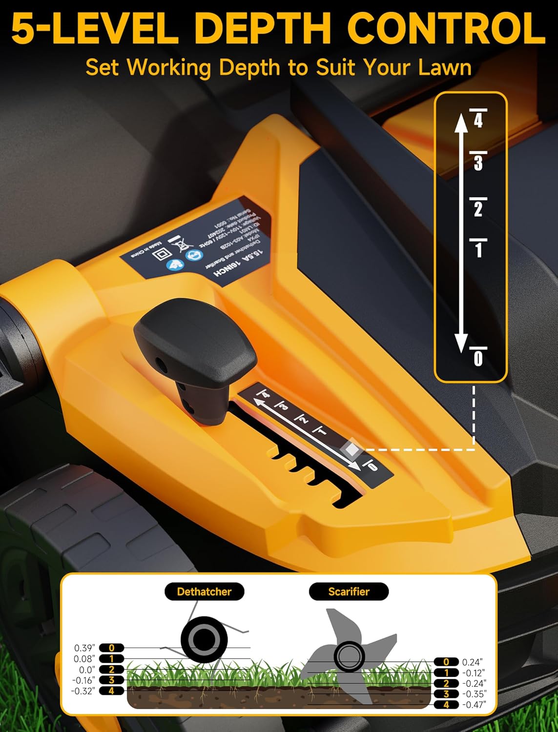 - 5-POSITION DEPTH ADJUSTMENT: 5-position depth control lever allows precise adjustment for different lawn needs. Scarifying depth ranges from -0.47" to 0.24", while dethatching depth ranges from -0.32" to 0.39". Adjustable settings provide effective lawn care for light maintenance or deeper treatment without harming healthy grass