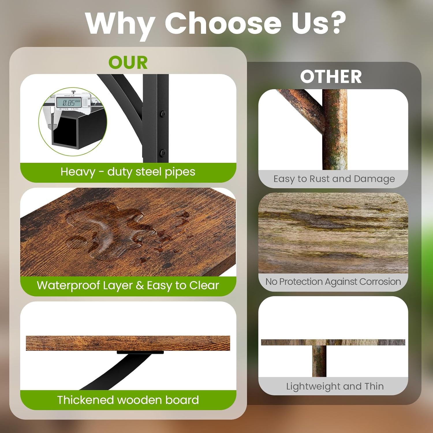- 【Sturdy & Durable Metal Plant Stand】: Crafted from robust steel tubes and high-quality wooden boards, this metal indoor plant stand offers exceptional stability and load-bearing capacity. The steel frame features a special anti-rust and anti-corrosion baked finish, while the thickened wooden shelves are coated with a water-resistant layer for durability and easy cleaning