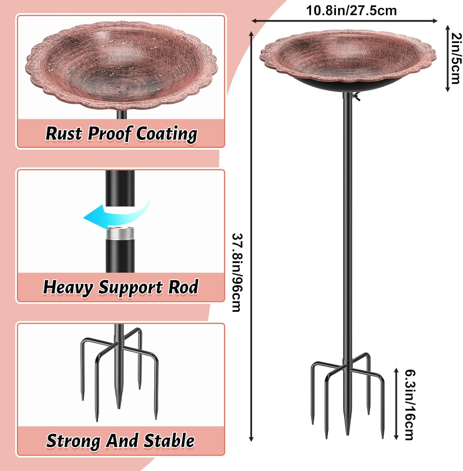 - Upgraded Sturdy Base:The bird bath is made from metal material, tall bird bath has 5-insert ground insert, more stable, not easily blown over by the wind