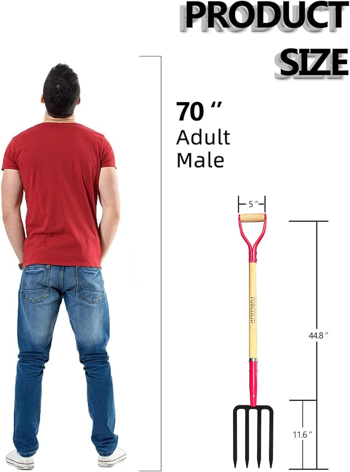 Garden Fork, 4-Tine Spading Digging Fork, Pitch Fork-45Inch, Forged Steel Y-Grip, Wood Handel-Red
