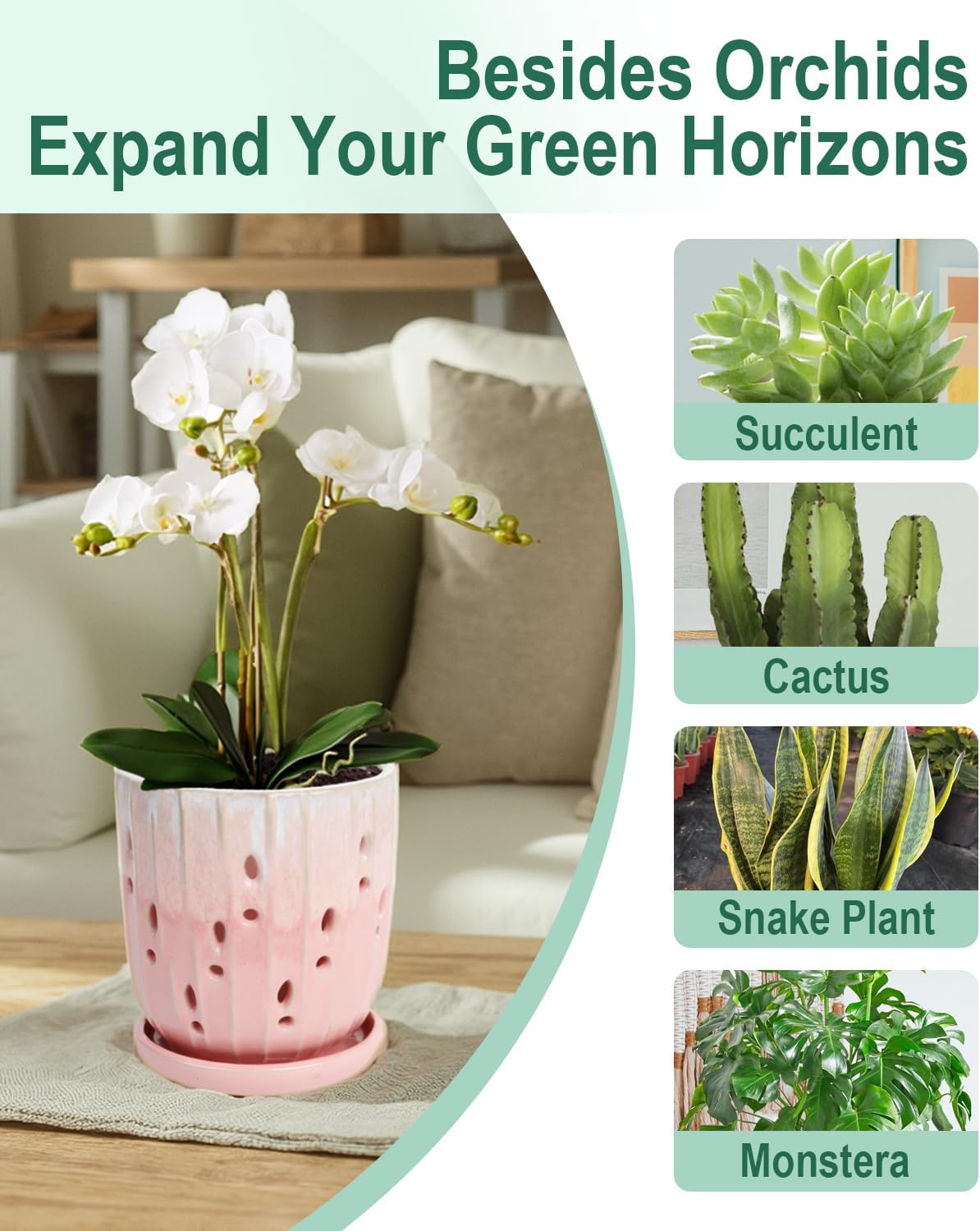 vensovo 6 Inch Ceramic Orchid Pot - Orchid Pot with Holes for Repotting, Ceramic Planter with Saucer for Indoor/Outdoor Plants, Pink