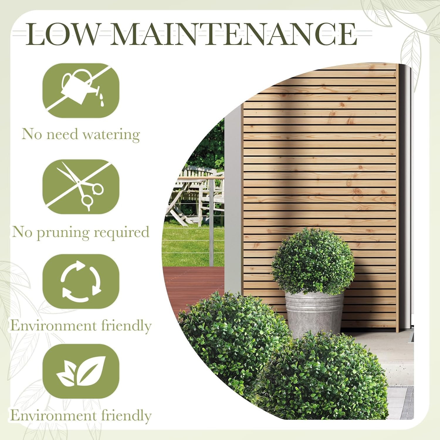 - Low Maintenance: our outdoor artificial shrubs do not need watering or pruning; No matter how the seasons change, they remain green and full of vitality all year round; Just put them anywhere you want to add a sense of decoration, and keep them beautiful green all year round
