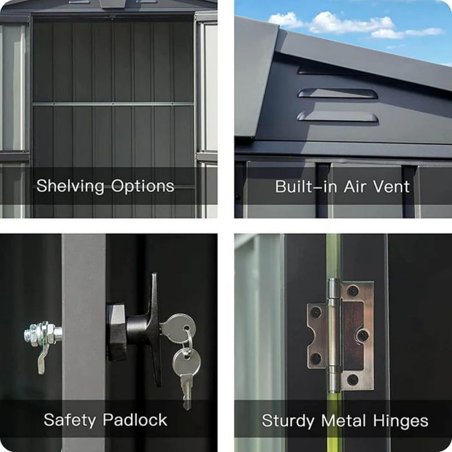 - 🛠️ High-quality Material - The outdoor metal shed uses thicker galvanized steel and a durable framework to ensure safe and all-weather use. Overlapped wall panels offer waterproof and moisture-resistant properties, perfect for all weather conditions.