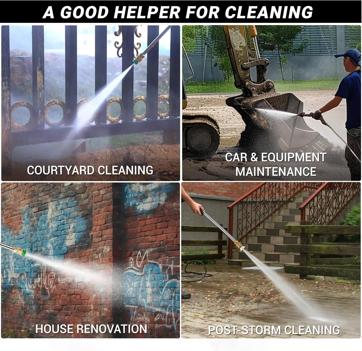 - 【4 Versatile Nozzles – Precision Cleaning Made Easy】Quickly switch between 0°, 25°, 40°, and soap nozzles to match any cleaning task. From blasting away tough grime to gently rinsing your car or patio furniture, this washer is perfect for gutters, sidewalks, decks, RVs, tools, and outdoor living spaces.