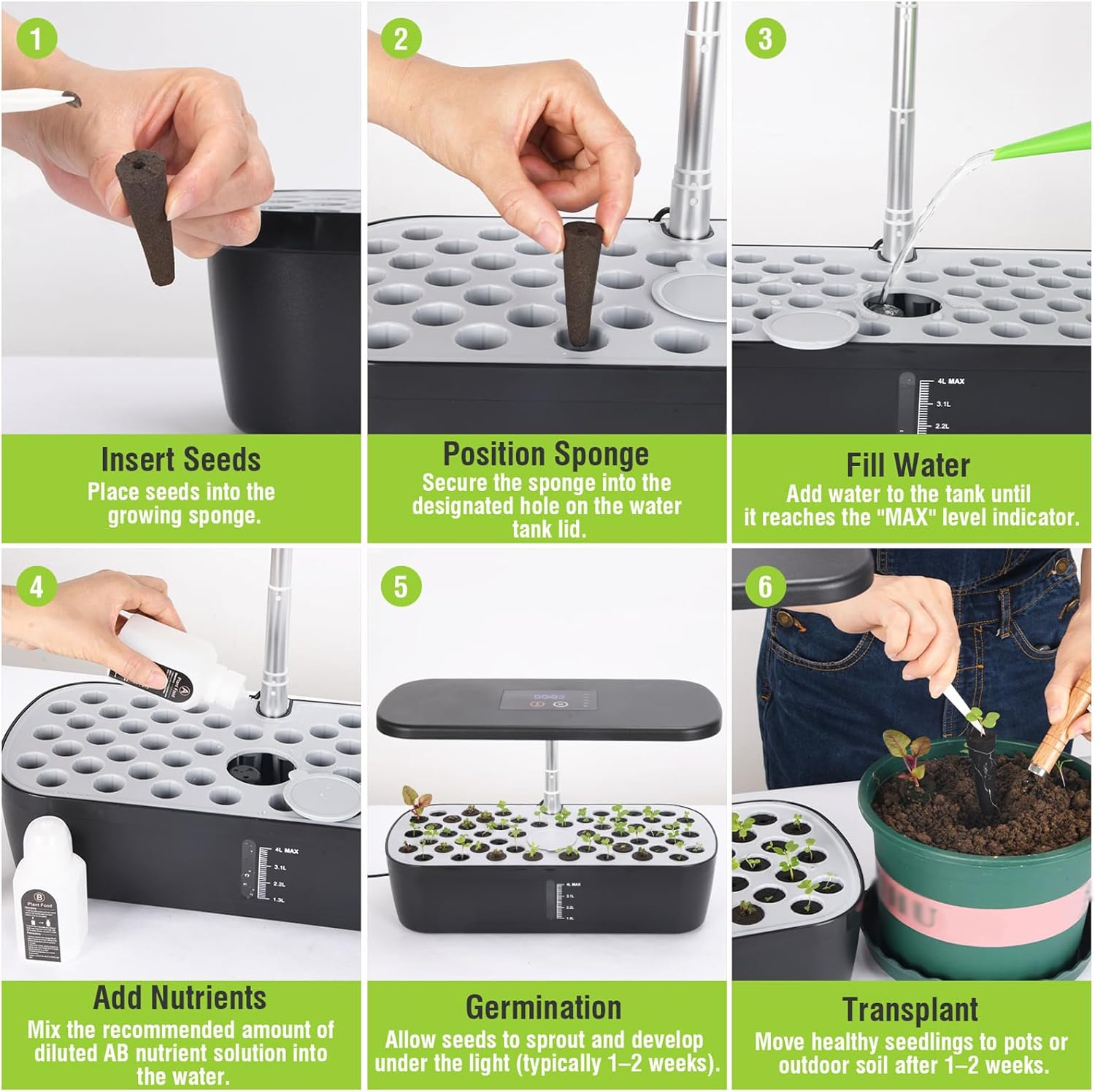 - 📏Adjustable Height Grow Light & Large Water Tank: The grow light can be raised as your plants grow, ensuring optimal light exposure without crowding. A 4L spacious water tank reduces refill frequency and supports longer growth cycles, making plant care simple and low-maintenance.
