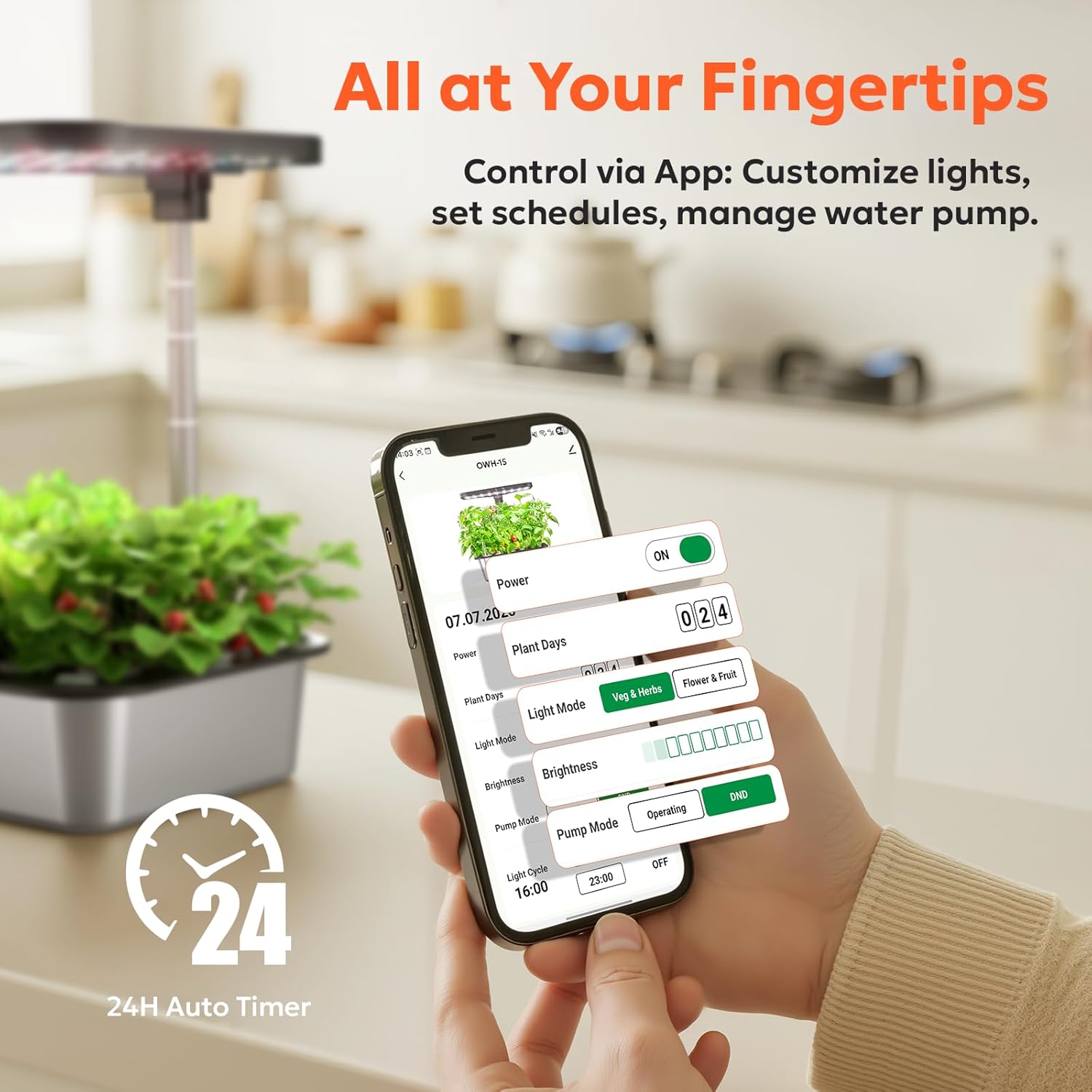 - 5X Faster Growth with 36W Full-Spectrum LED: Our garden kit indoor, whether nurturing young seedlings or helping flowering strawberries and peppers thrive. Choose dedicated light modes (Vegetable, Flower/Fruit) control panel/ APP or use 10-level dimming via the APP. The LED grow light of this indoor growing kit precisely tailors the light spectrum (blue for leafy greens, red for fruiting plants) and sets the perfect 0-24H day/night cycle to mimic natural sunlight for optimal photosynthesis.
