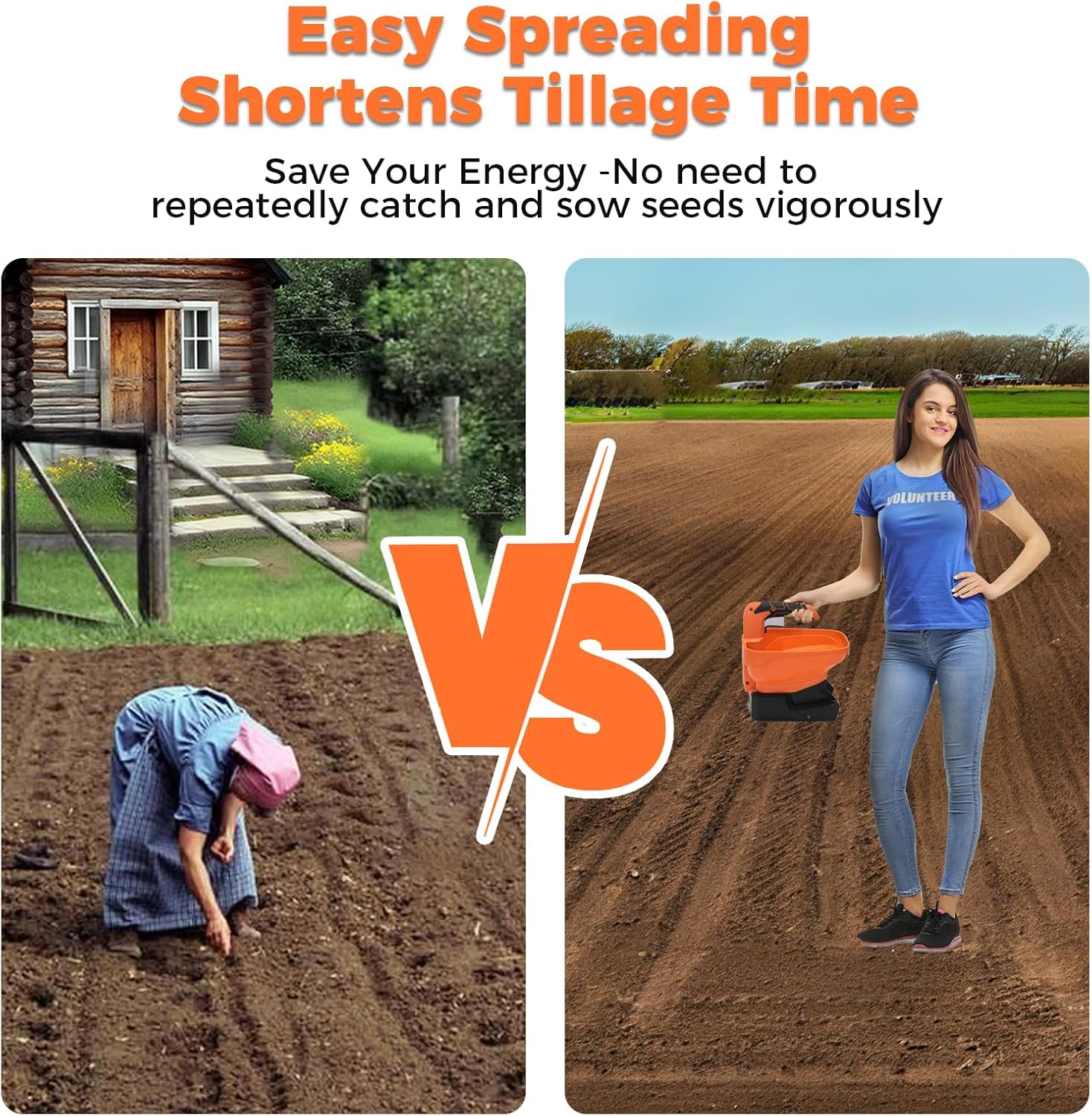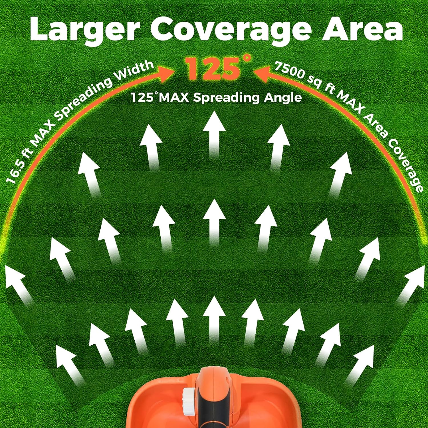 - 【Large Capacity & Wide Coverage】Our grass seed spreader has a large 3.3L capacity, with a spreading width of 16.5 feet and coverage area of 7,500 square feet. Spreading begins at an adjustable range of 125°, creating a wide and even coverage.