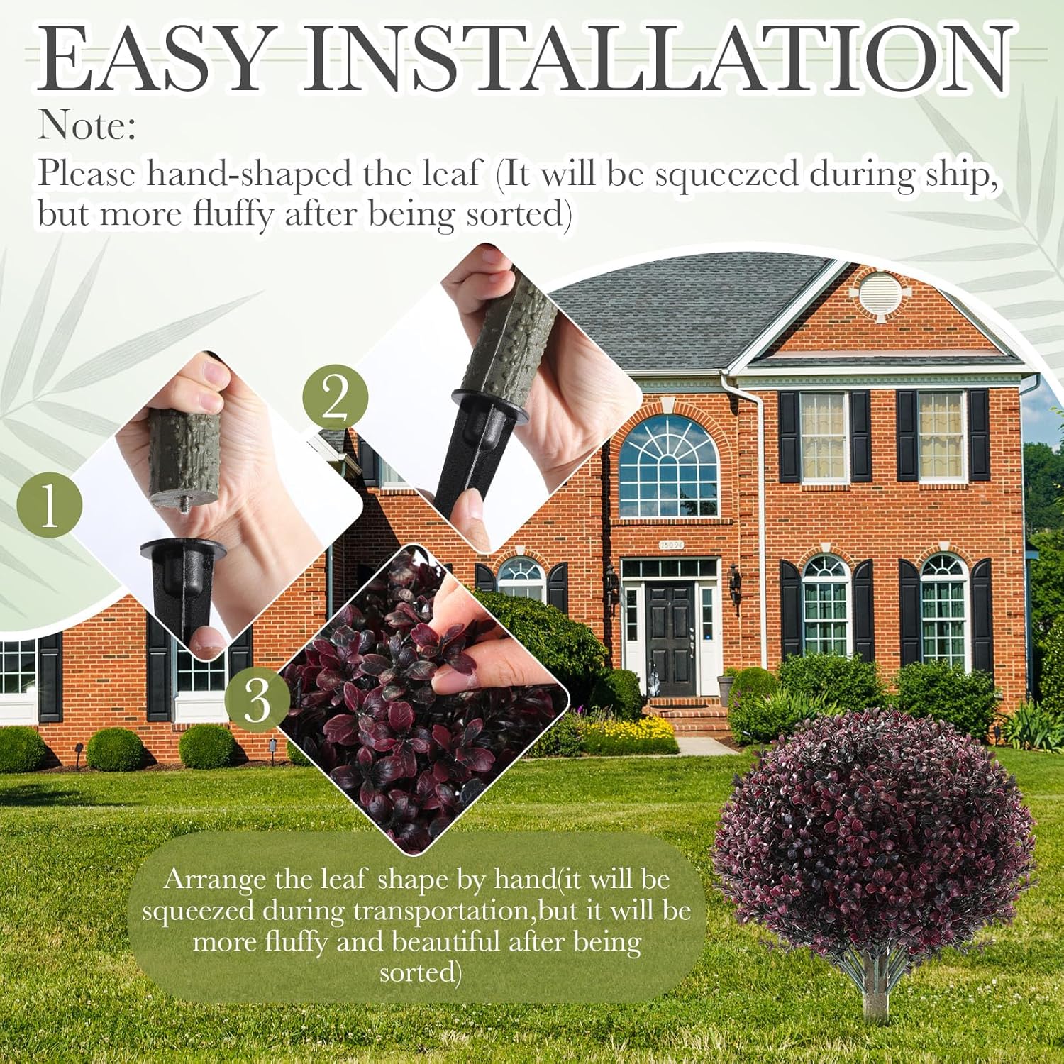 - Easy Installation: after assembly, you may need to manually adjust the leaves to achieve the desired shape; The design of the ground spike allows you to easily insert it into soil, grass or flowerpot without additional tools, making the installation simple and the placement flexible; If any leaves fall off during unpacking, just reattach them to the branches effortlessly