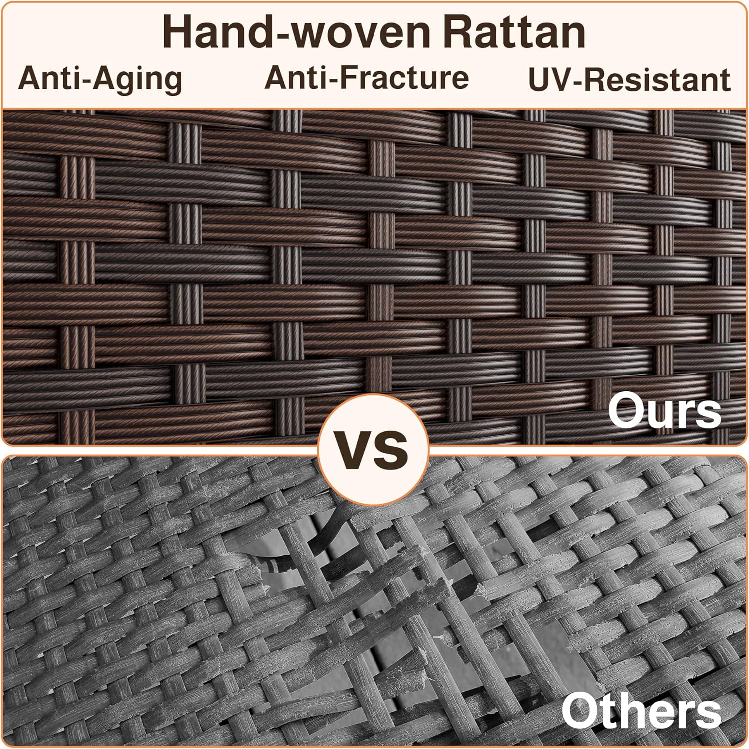 - Durable & Weather-Resistant Materials: This patio furniture set features woven PE rattan and a sturdy steel frame for enhanced durability. It resists cracking, fading, and rust, making it suitable for various outdoor environments. The glass tabletop is easy to clean, and seat clips help keep the outdoor chairs securely in place.