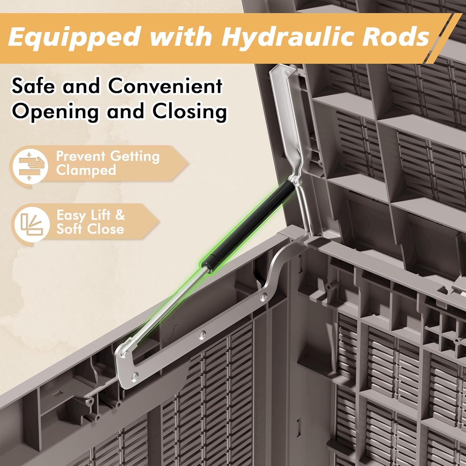 - š Hydraulic Lid with Lockable Design for Safe Access Equipped with hydraulic gas lift rods, the lid opens smoothly and closes gently to prevent pinched fingers. The lockable lid adds an extra layer of security, making it an ideal choice for shared outdoor spaces or secure backyard storage. (Lock not included)