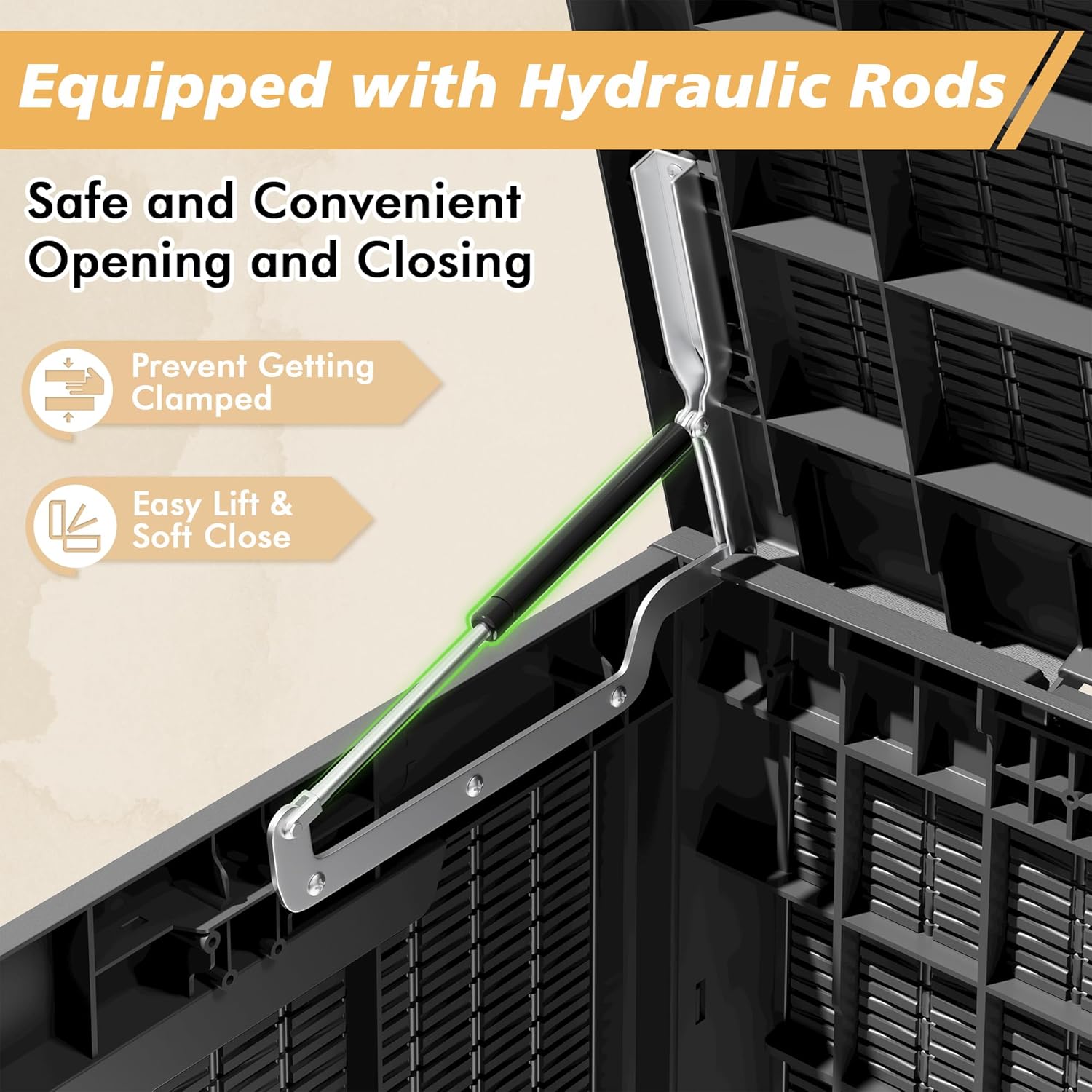 - š Hydraulic Lid with Lockable Design for Safe Access Equipped with hydraulic gas lift rods, the lid opens smoothly and closes gently to prevent pinched fingers. The lockable lid adds an extra layer of security, making it an ideal choice for shared outdoor spaces or secure backyard storage. (Lock not included)