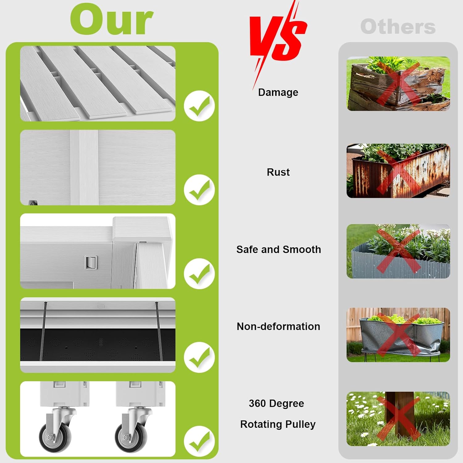 - EASY MOBILITY & STORAGE: Equipped with 360° rotating wheels, this planter box can be effortlessly repositioned to maximize sunlight exposure. The sturdy leg design provides additional stability, making it both easy to move and securely placed when needed.