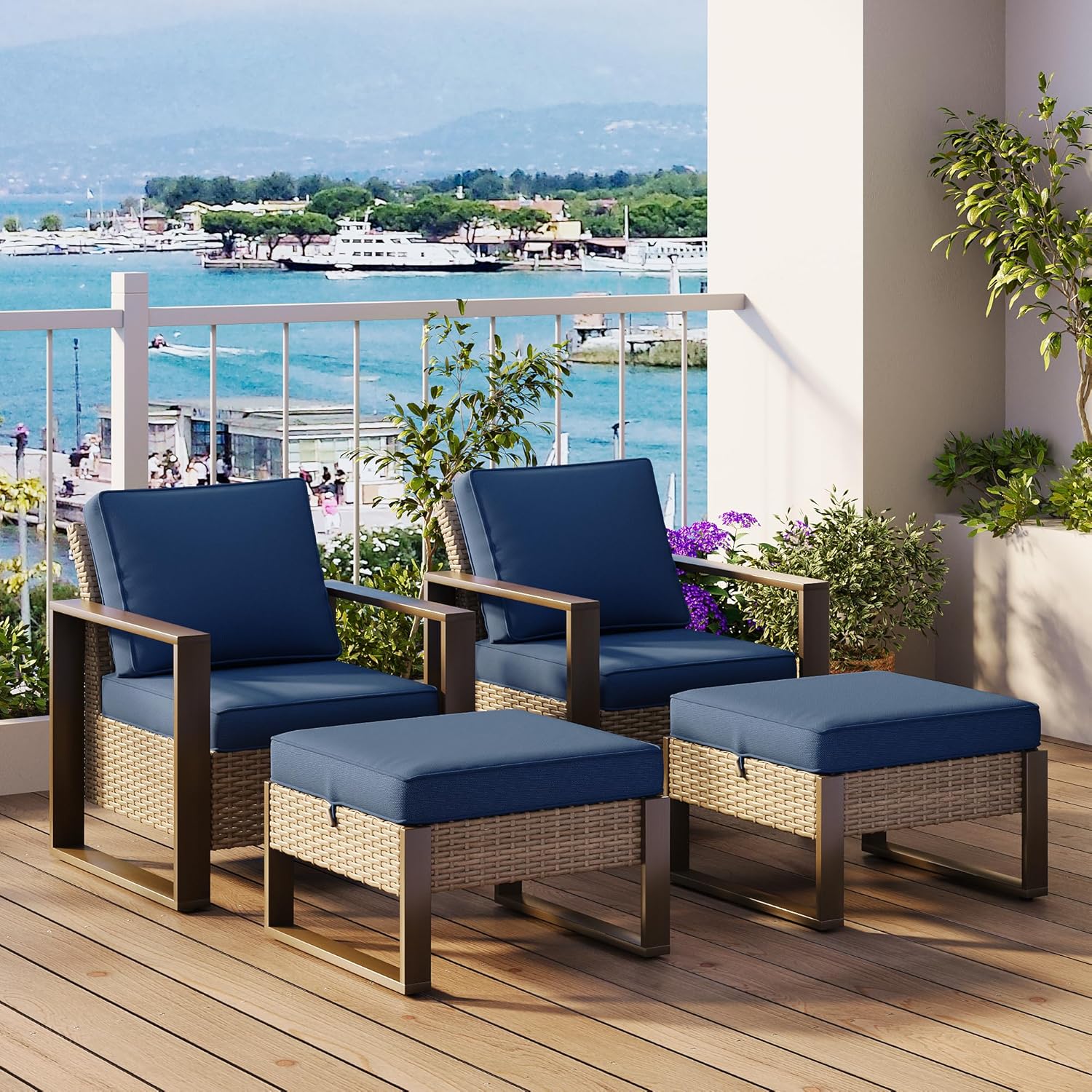 Outdoor Wicker Metal Chairs Set of 2 with Two Ottomans - 4 Pieces Patio Bistro Set with Rectangular Framed Wood-Looking Metal Armrest & Removable Cushions for Poolside, Terrace, Dark Blue