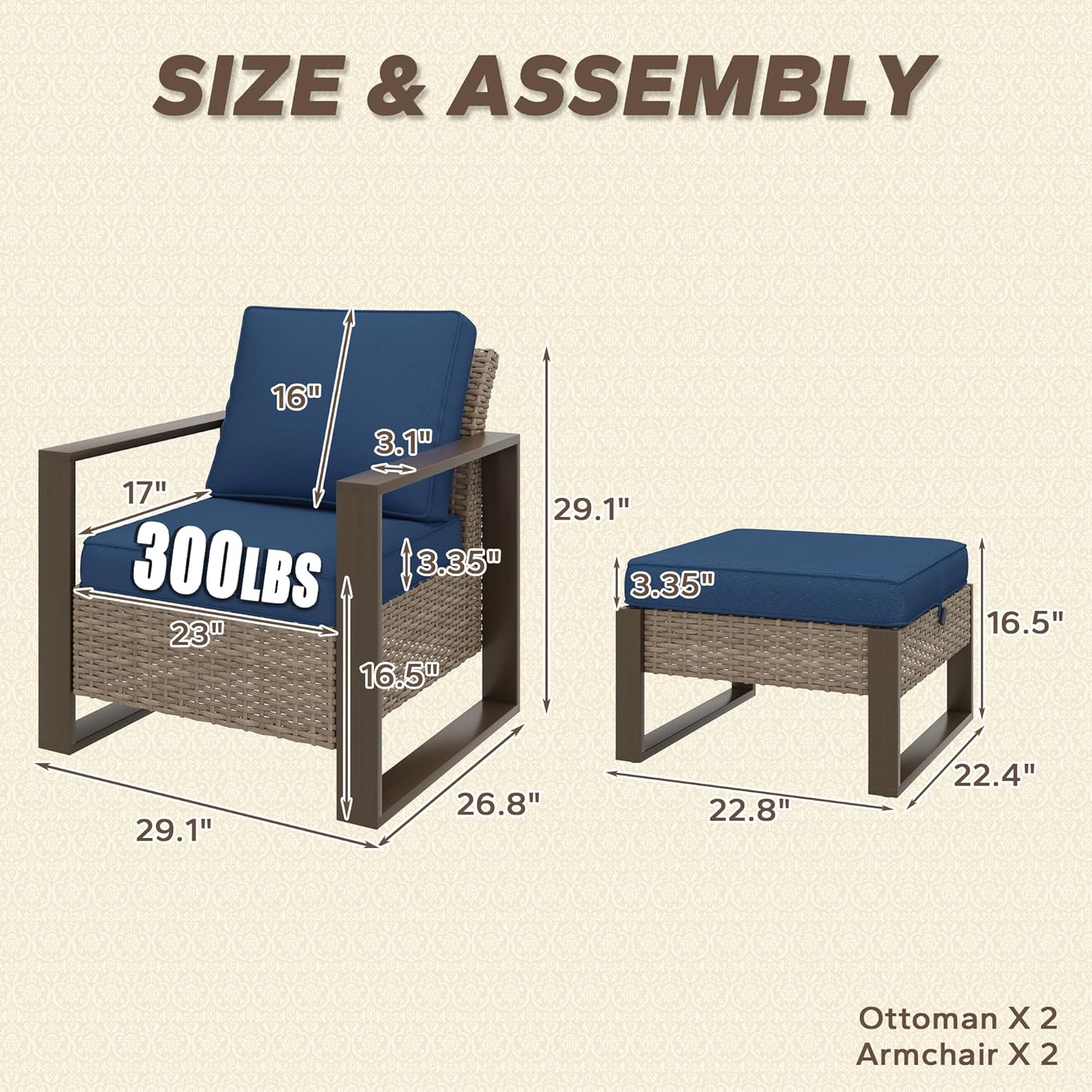 - Size : 4 PCS Chairs & Ottomans Set