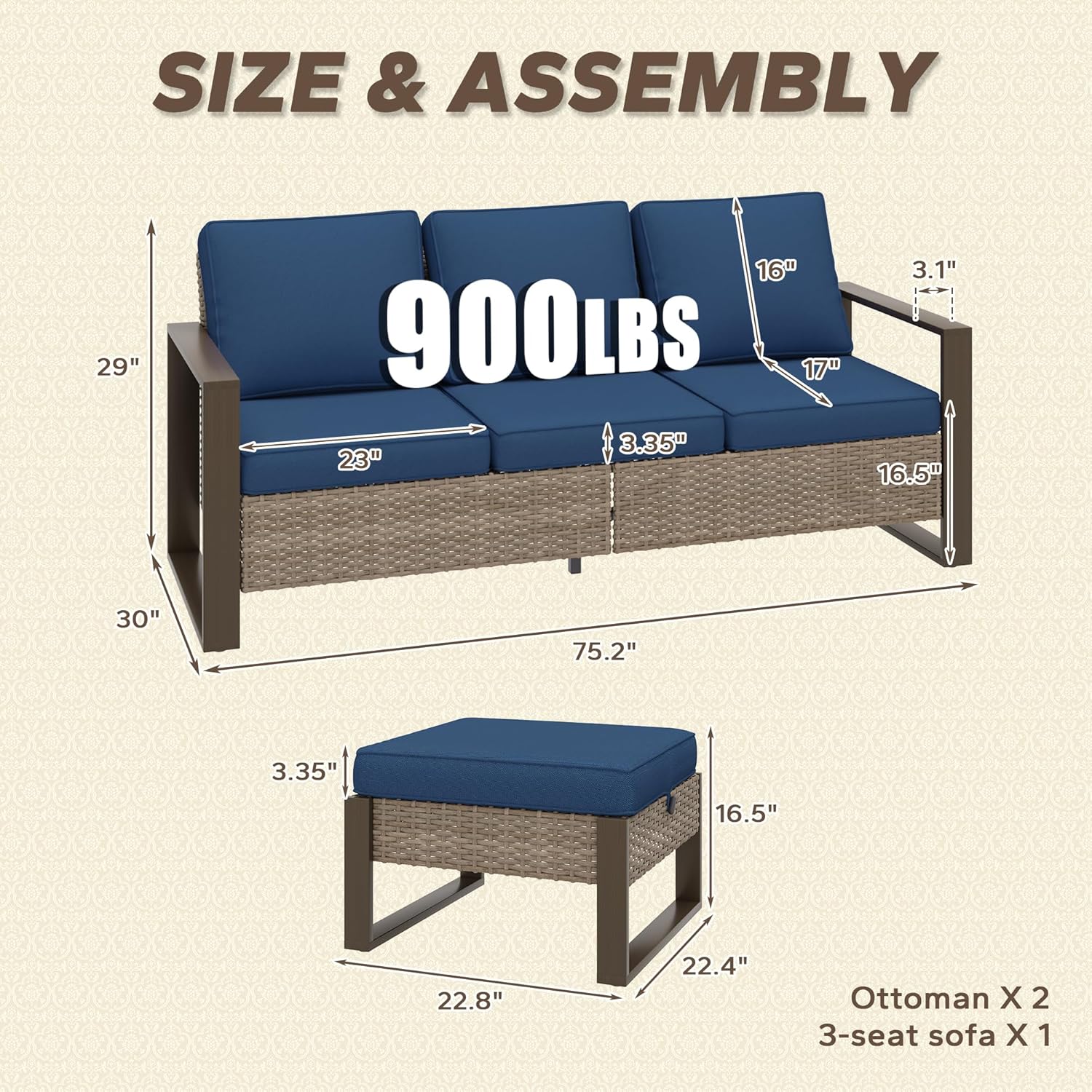 Wicker Patio 75" Sofa Set with Two Ottomans, All Weather Rattan Outdoor Conversation Furniture Set with Wood-Looking Metal Armrest for Deck Backyard Porch, Dark Blue
