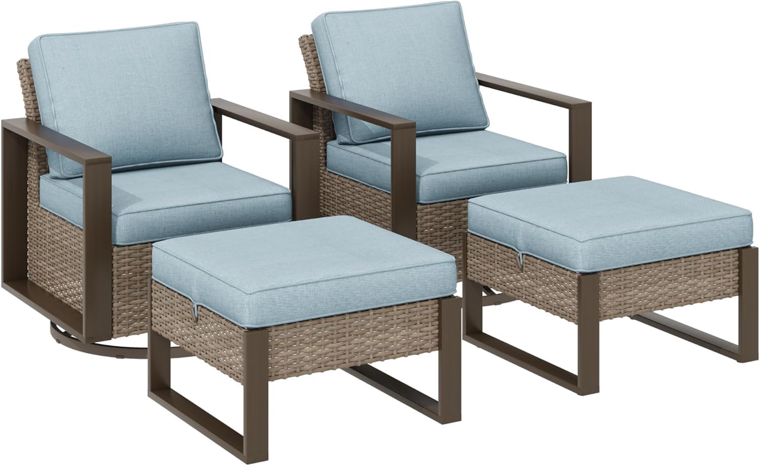 Outdoor Wicker Metal Chairs Set of 2 with Two Ottomans, 360 Degree Glider Rockers Armchairs, 4 Pieces Patio Bistro Set with Wood-Looking Metal Armrest for Poolside, Terrace, Baby Blue