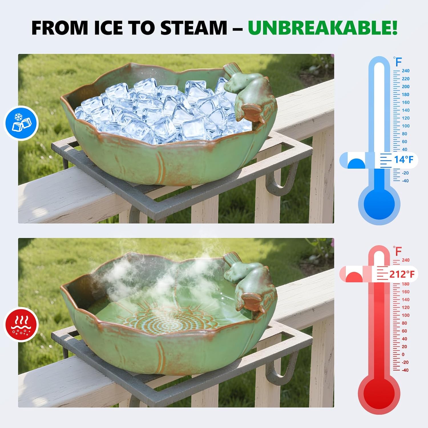 - Premium Ceramic Bird Bath – Built to Last: Unlike cheap resin, our thick, high-fired ceramic bird bath bowl resists peeling, cracking, and fading—even in extreme heat or frost. The non-toxic glaze ensures safe drinking water for birds, squirrels, and pollinators.