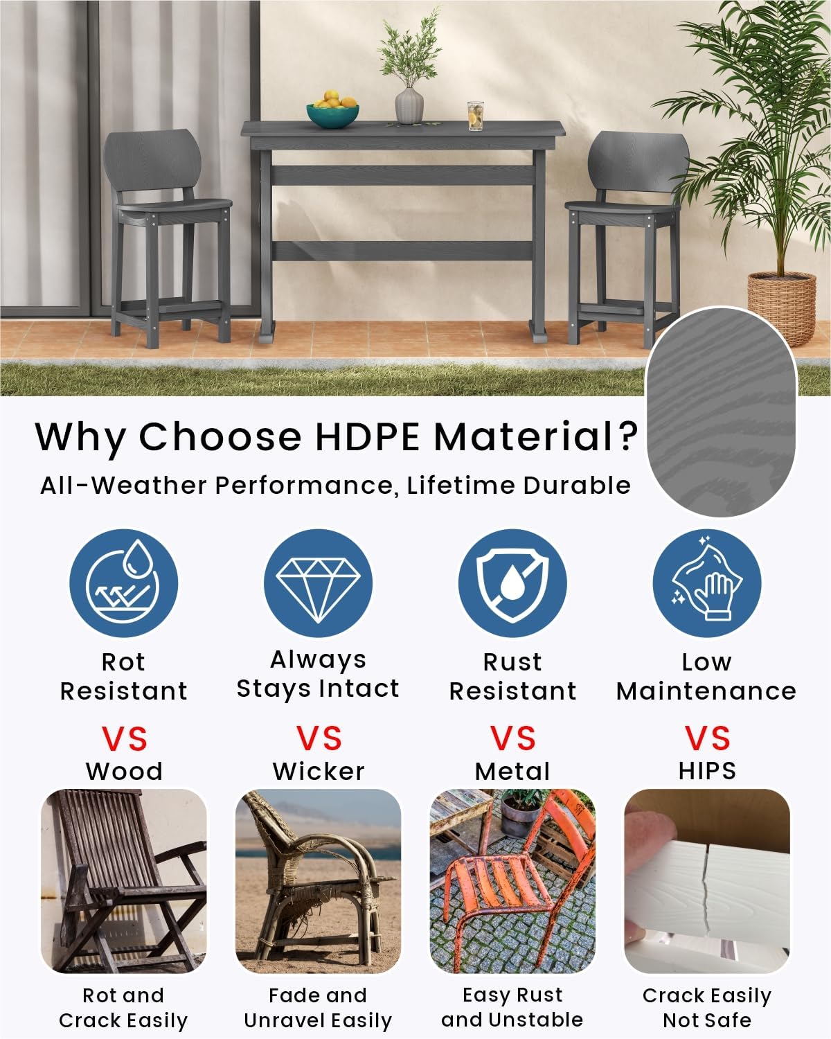 - Long-lasting Performance: Crafted with durable HDPE materials and a robust structure, this patio bar set is engineered to endure over 15 years—regardless of setting or climate.