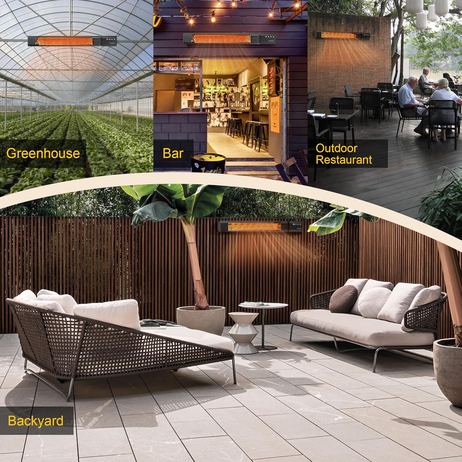 - Flexible Mounting Anywhere โ Wall or ceiling installation for patios, gazebos, balconies, BBQ decks, or garages. Ideal as outdoor electric heater, outside heater for your patio, or shop heater for garage, blending into both home and commercial spaces