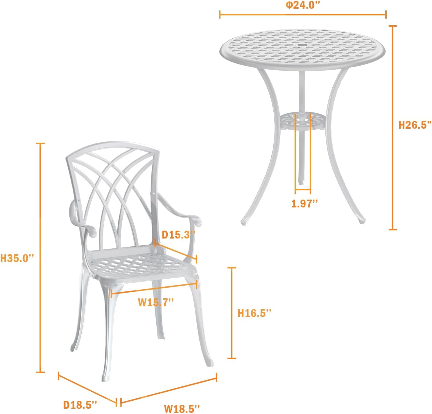 Patio Bistro Set 3 Piece, Cast Aluminum Bistro Set for 2 w/Umbrella Hole, Outdoor Table and Chairs Set of 2, Bistro Set for Balcony/Backyard/Garden, White