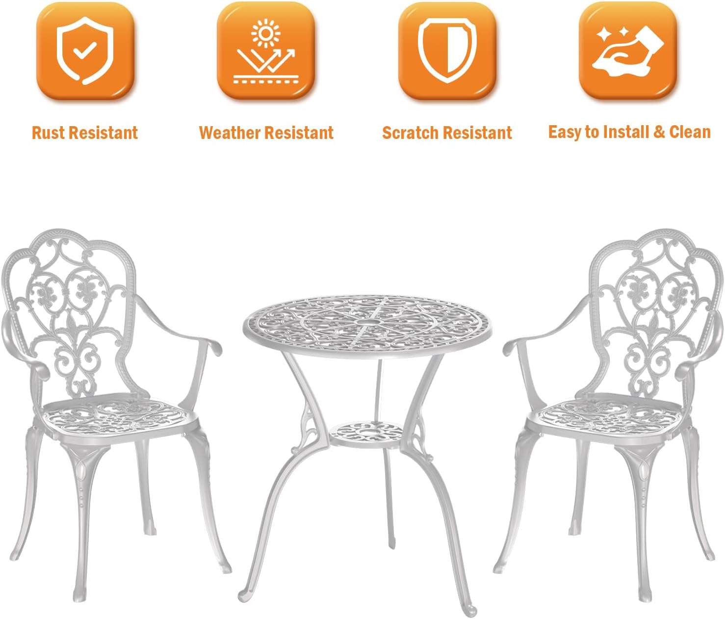 - ăDurable Cast AluminumăMade of anti-rust, weather-resistant cast aluminum, making bistro set perfect for long-term outdoor use in any climate